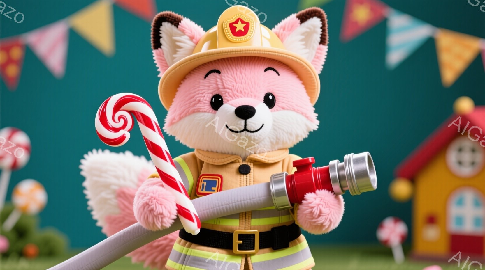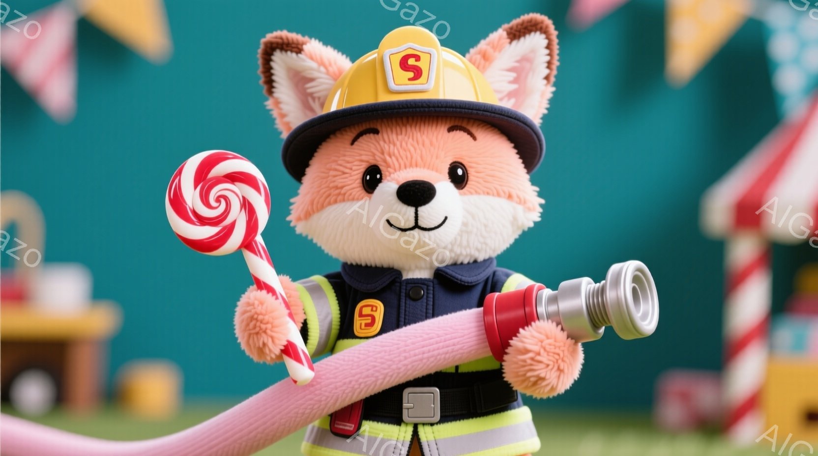 明るい緑色の背景に、消防士の制服を着た愛らしいキツネが立っています。キツネは黄色いヘルメットをかぶり、赤いホースを抱え、口元には微笑みが浮かんでいます。背景には様々な色や形のキャンディーが散りばめられており、全体的に明るく楽しい雰囲気です。