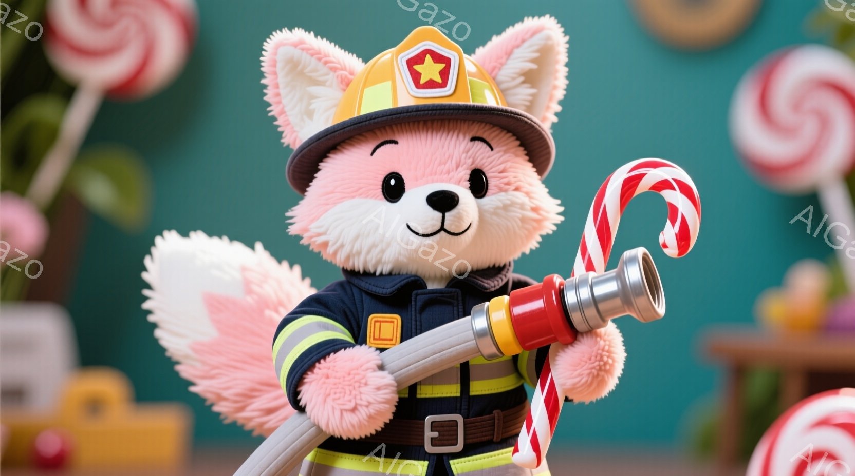ふわふわのピンク色の動物(おそらく犬)が消防士の衣装を着て立っています。頭には消防士のヘルメットをかぶり、片手に赤いキャンディ、もう片手には消防ホースを持っています。背景にはカラフルな旗や小さな家があり、全体的に明るく楽しい雰囲気です。