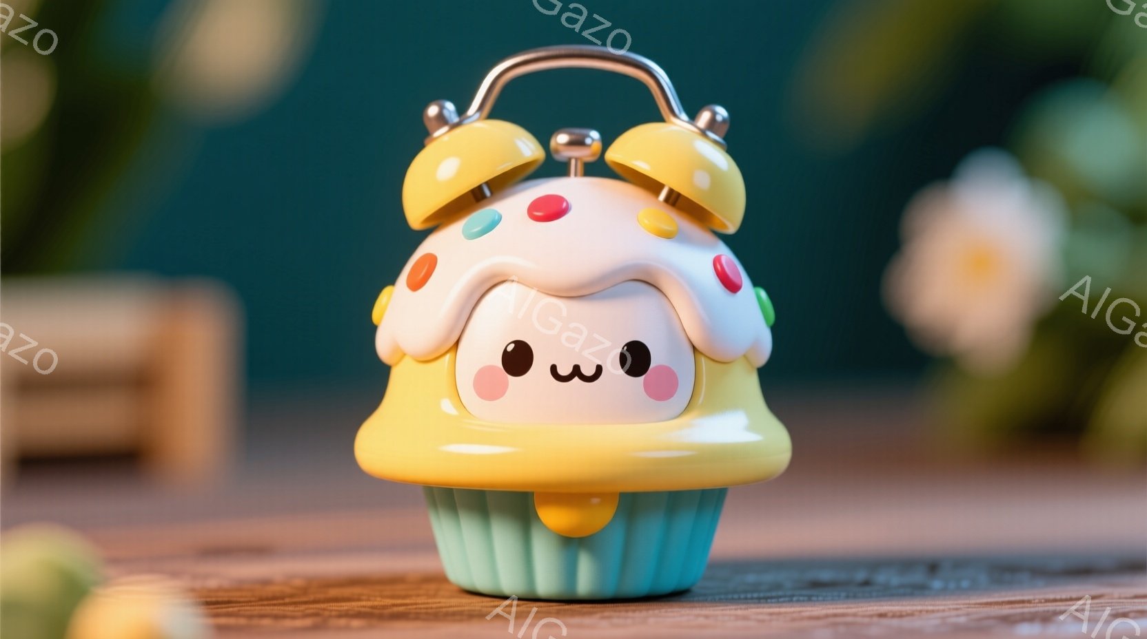 カップケーキを模した可愛らしい目覚まし時計が、明るいターコイズブルーの背景の前で静止している。クリーム部分にはカラフルなトッピングが施され、時計本体は黄色と茶色のグラデーションで、愛らしい表情を浮かべている。背景にはぼやけた植物と柔らかな照明が見られ、全体的に温かく、遊び心のある雰囲気を醸し出している。