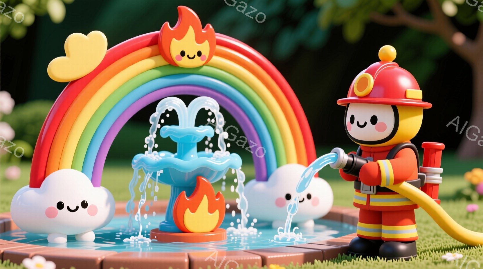 プールサイドで消防士と可愛らしいキャラクターがいます。消防士は赤い制服、黄色い反射材、ヘルメットを着用し、ホースで水を噴射しています。キャラクターは黄色い髪型に赤いリボン、白いシャツに青いズボンを着用し、プールの中で水しぶきを楽しんでいます。