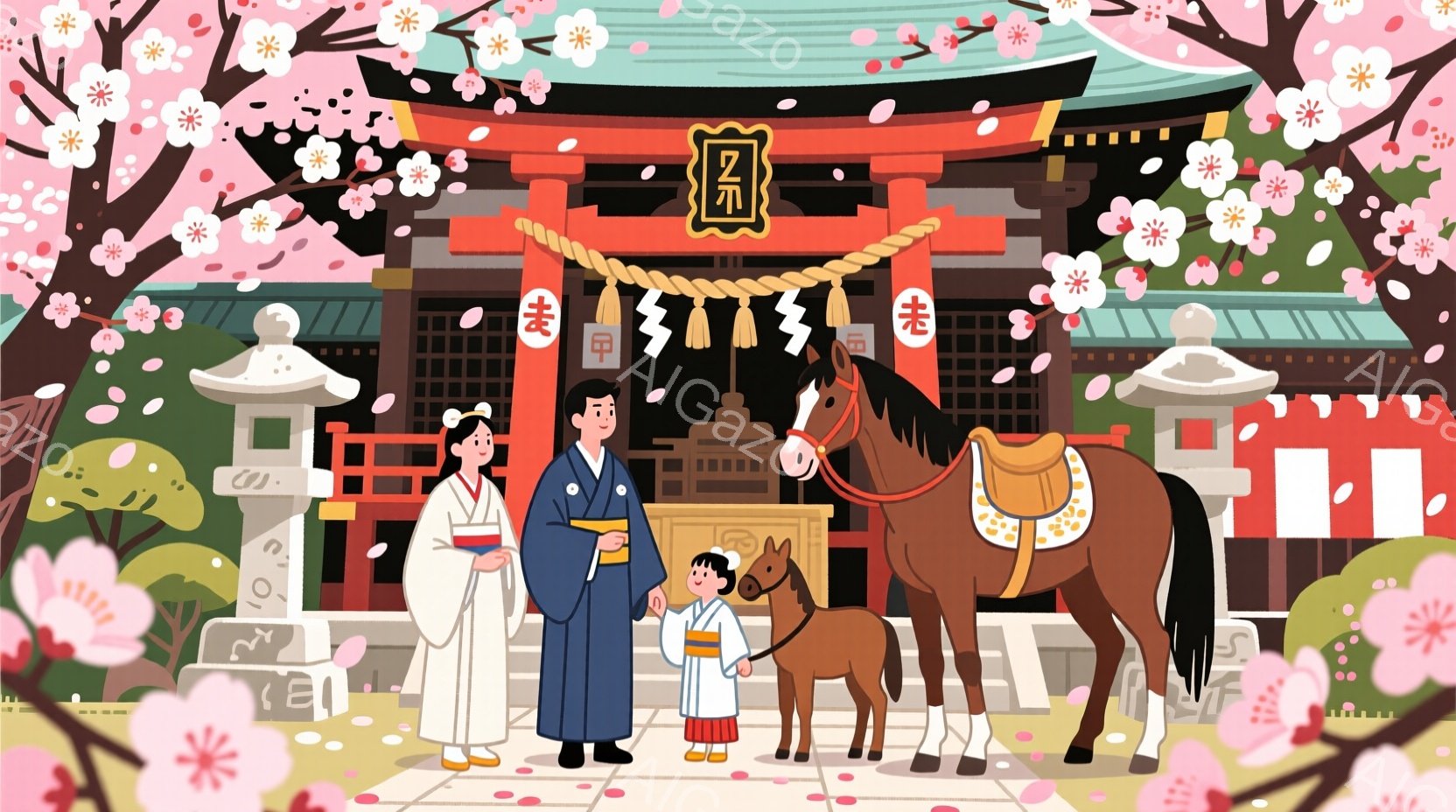 着物姿の少年と少女が、それぞれ白と栗色の馬と共に神社に立っています。少年は濃い青色の着物を着て、黒髪を後ろで束ねています。背景には、桜の花びらが舞い散る中で、朱色の鳥居や屋根の美しい神社が見え、全体的に穏やかで華やかな雰囲気が漂っています。