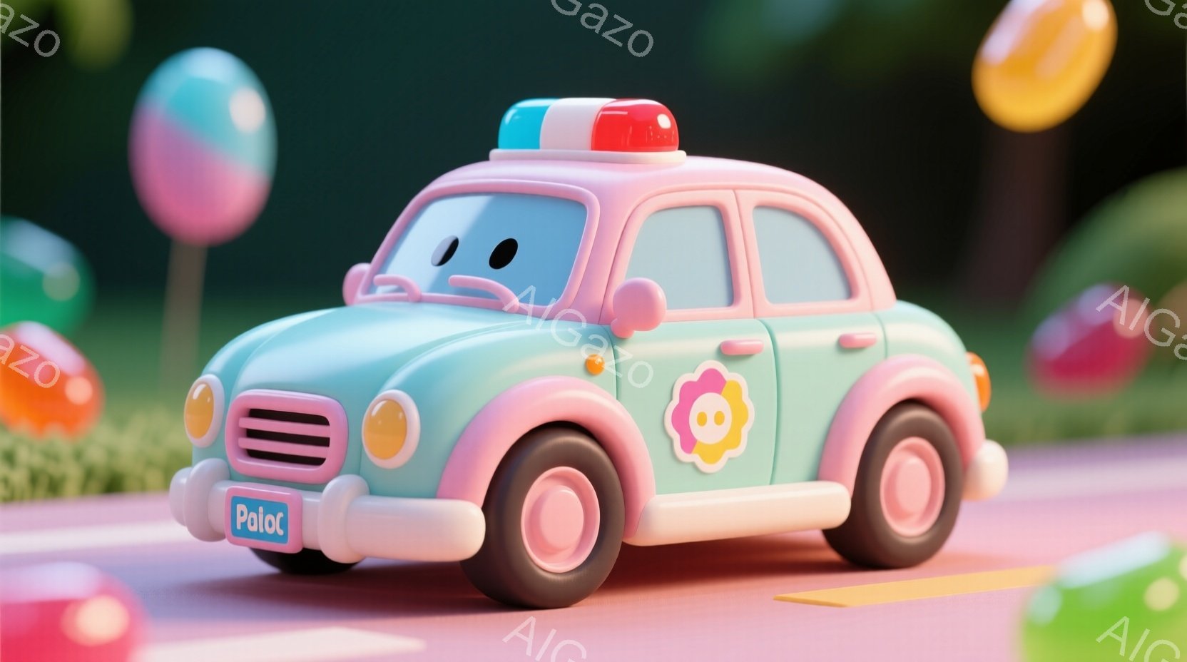 明るい水色のレトロなパトカーが、ピンク色のタイヤとバンパーで可愛らしく装飾されています。車両には笑顔の顔が描かれており、その上に赤いサイレンライトが設置されています。背景にはカラフルなキャンディや花が咲き乱れ、陽気で遊び心溢れる雰囲気を醸し出しています。