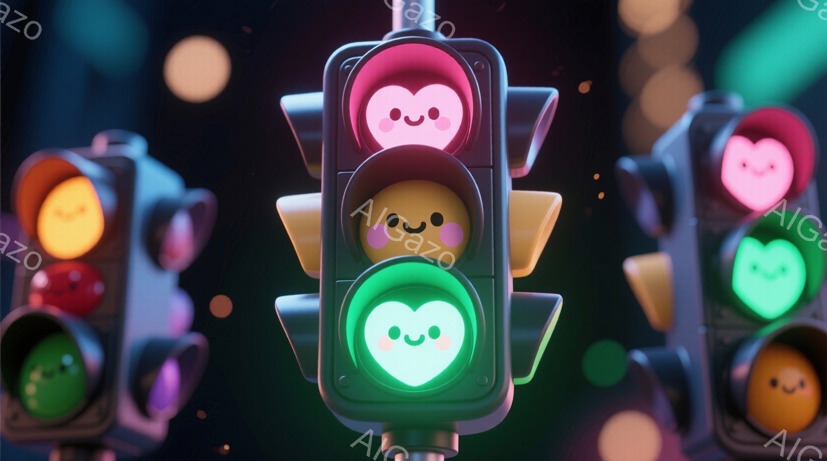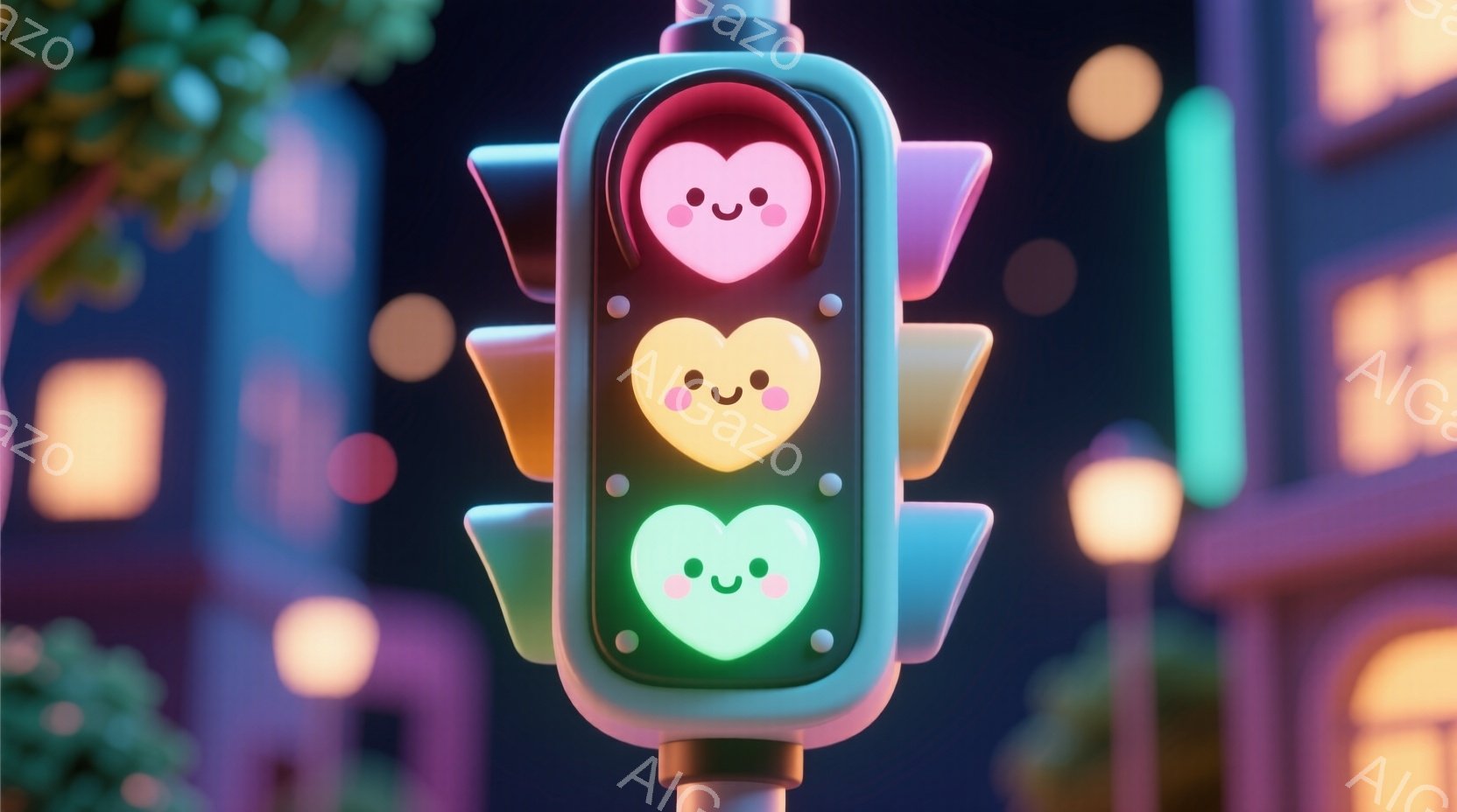 信号機が可愛らしい顔で表現されており、上部は赤色、下部は緑色で、それぞれ笑顔の表情が描かれています。背景には、ぼんやりとした街並みと、空中に浮かぶピンク色のハートが散りばめられており、幻想的な雰囲気を醸し出しています。全体的に柔らかい色彩と可愛らしいデザインが、温かくロマンチックな印象を与えます。