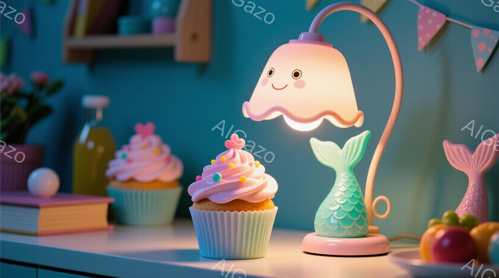 淡いピンク色のテーブルの上に、クリーム色のアイシングを乗せたカップケーキと、人魚の尾びれをモチーフにしたピンク色のランプが置かれています。ランプのシェードは愛らしい表情をしており、優しい光を放っています。背景には、カラフルな旗が飾られており、全体的に明るく、遊び心のある雰囲気が漂っています。