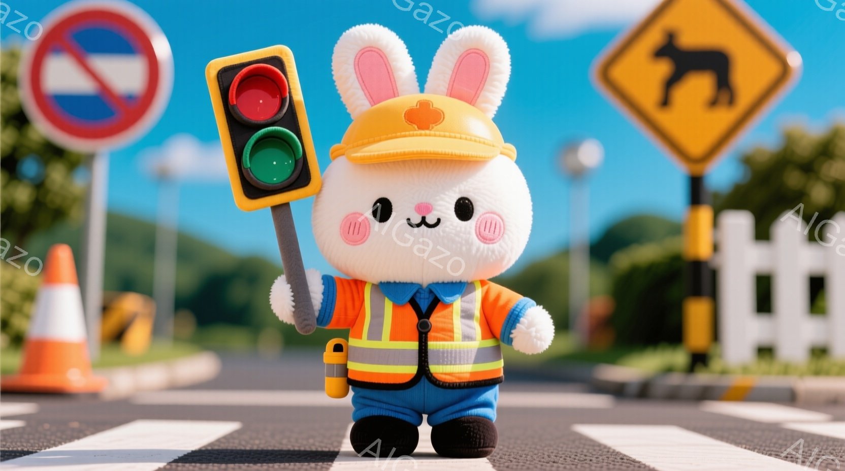 白いウサギが工事現場の作業員として描かれており、黄色いベストと濃い青のズボン、そして工事用のヘルメットを着用しています。ウサギはゼブラ crossingの上で立ち、片手に信号機を持ち、真剣な表情で交通整理を行っているように見えます。背景には交通標識やコーンが配置され、晴天の下、明るく活気のある雰囲気が漂っています。