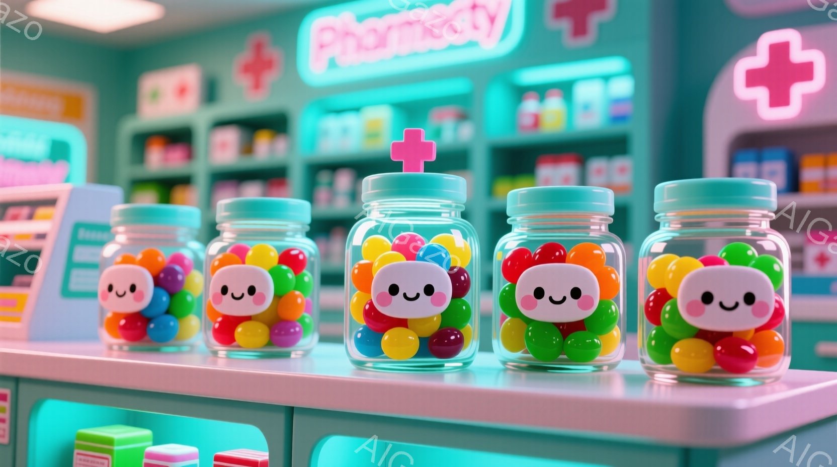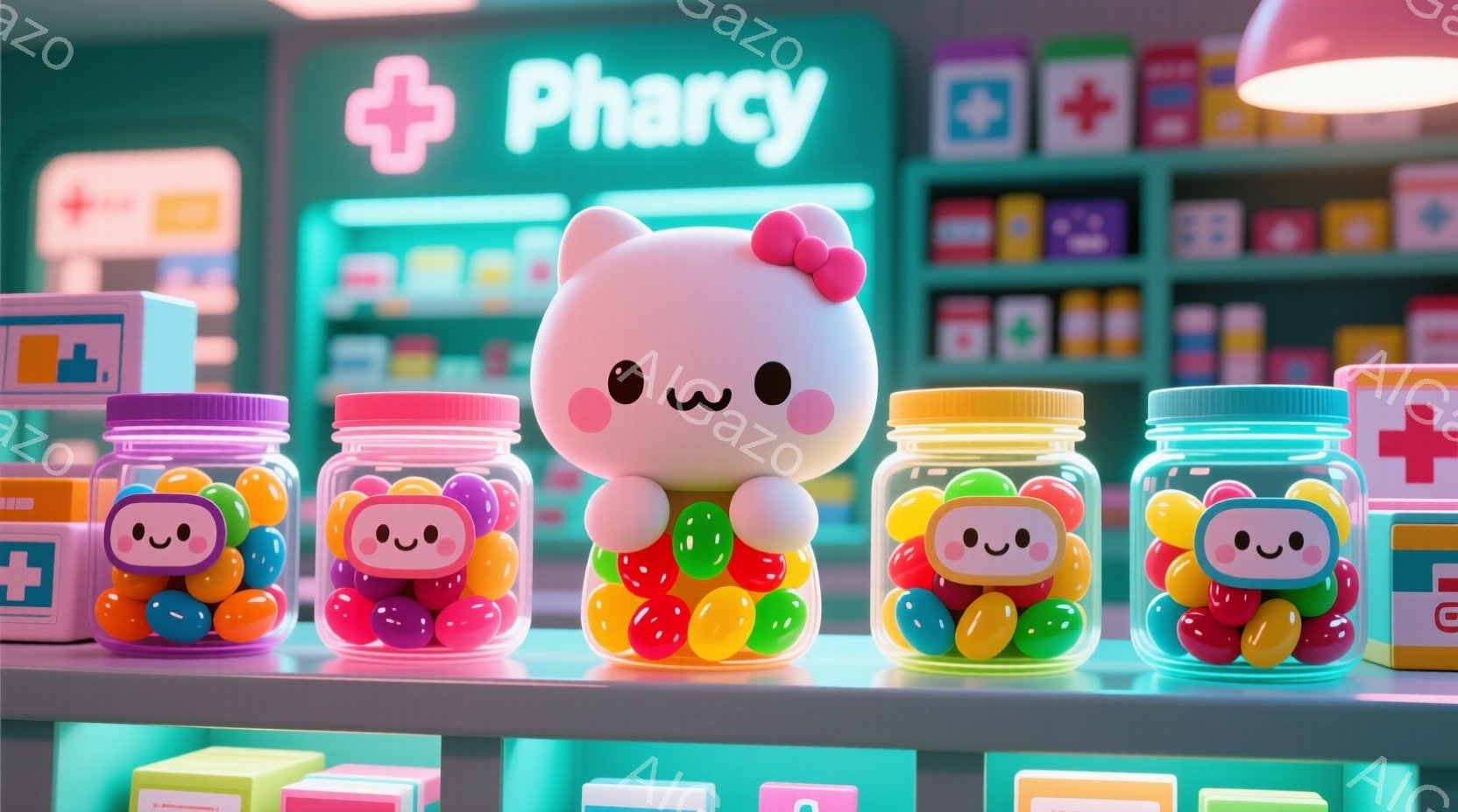 明るいピンク色の背景に、カラフルなキャンディが詰まったガラス瓶がカウンターに並べられています。背景には医薬品が並んだ棚があり、全体的にポップで可愛らしい薬局の雰囲気です。明るい照明と柔らかな色使いが、親しみやすい印象を与えています。