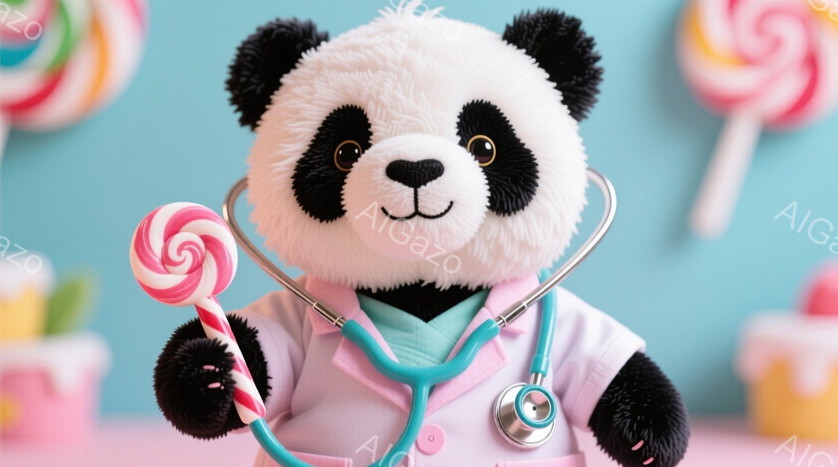 白黒のパンダが医者の衣装を着て、首から青い聴診器をかけています。パンダは少し微笑んでおり、片手にピンクと白の渦巻き模様のキャンディを持っています。背景には、様々な色や形のキャンディが置かれた、明るくお祭り騒ぎのような雰囲気のセットが広がっています。