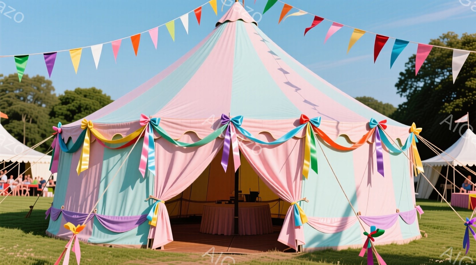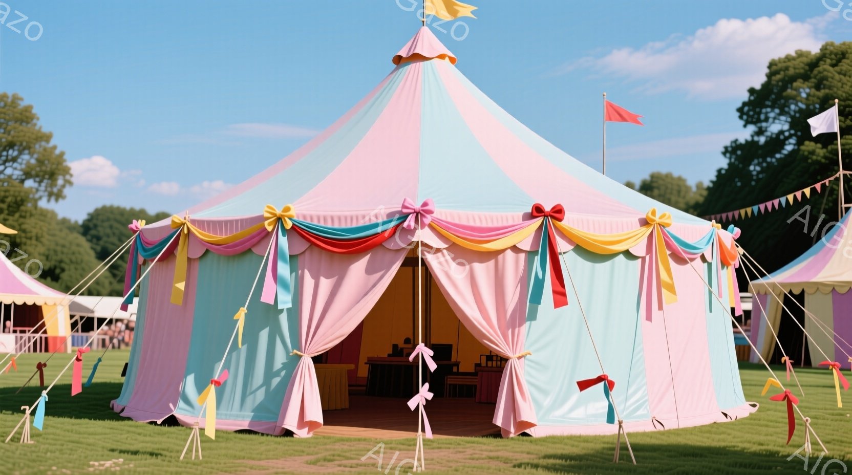 広々とした緑の芝生の上に、カラフルなストライプが特徴的な大きなテントが立っている。ピンク、水色、黄色、オレンジなどの鮮やかな色が使われており、テントの入り口には虹色のリボンが結び付けられている。背景には他のテントや木々が見え、晴天の下、明るく華やかな雰囲気が漂っている。