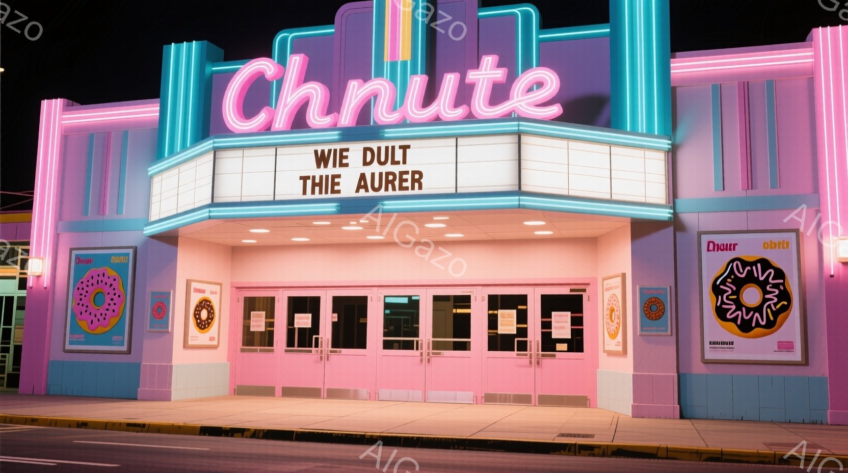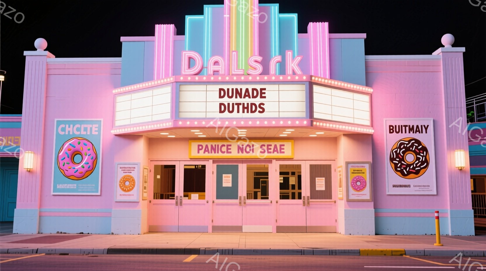 夜の背景に、ピンクとターコイズブルーのネオンカラーで装飾された映画館が写っています。看板には「DUVE」と書かれており、ドーナツのイラストが左右の壁に描かれています。映画館は夜間照明が点いており、華やかでどこか懐かしい雰囲気を醸し出しています。