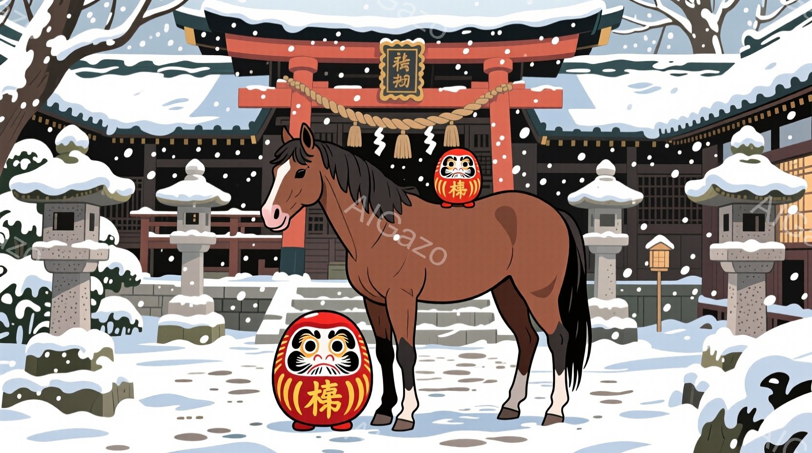 雪景色の中に、朱色の大きな鳥居と、それに続く建物が見える。茶色の馬が鳥居の前に立っており、その足元には招き猫の置物が置かれている。背景には雪を頂いた木々があり、全体的に静かで穏やかな冬の雰囲気を醸し出している。