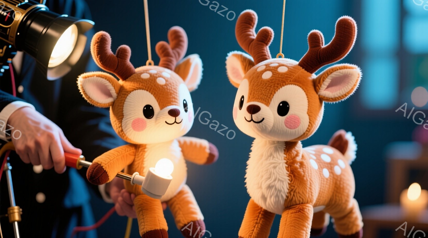 柔らかい茶色の鹿のぬいぐるみがおもちゃ作りの背景で前面にあります。 一人の男性が黒い髪と白いシャツを着て、ぬいぐるみを支えています。背景には、青色の壁と撮影用ライトがあり、おもちゃ作りの温かく遊び心のある雰囲気を醸し出しています。