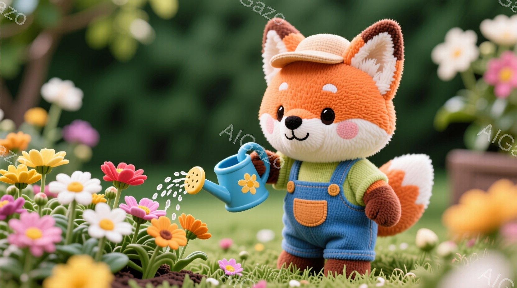 ふわふわのオレンジ色のキツネが、オーバーオールと麦わら帽子を身に着けて、花壇に水をやっています。キツネは優しい笑顔で、小さなジョウロから水が花に降り注ぎ、背景には色とりどりの花が咲き乱れ、暖かく穏やかな雰囲気です。鮮やかな色彩と柔らかい質感で、可愛らしい牧歌的な光景が描かれています。