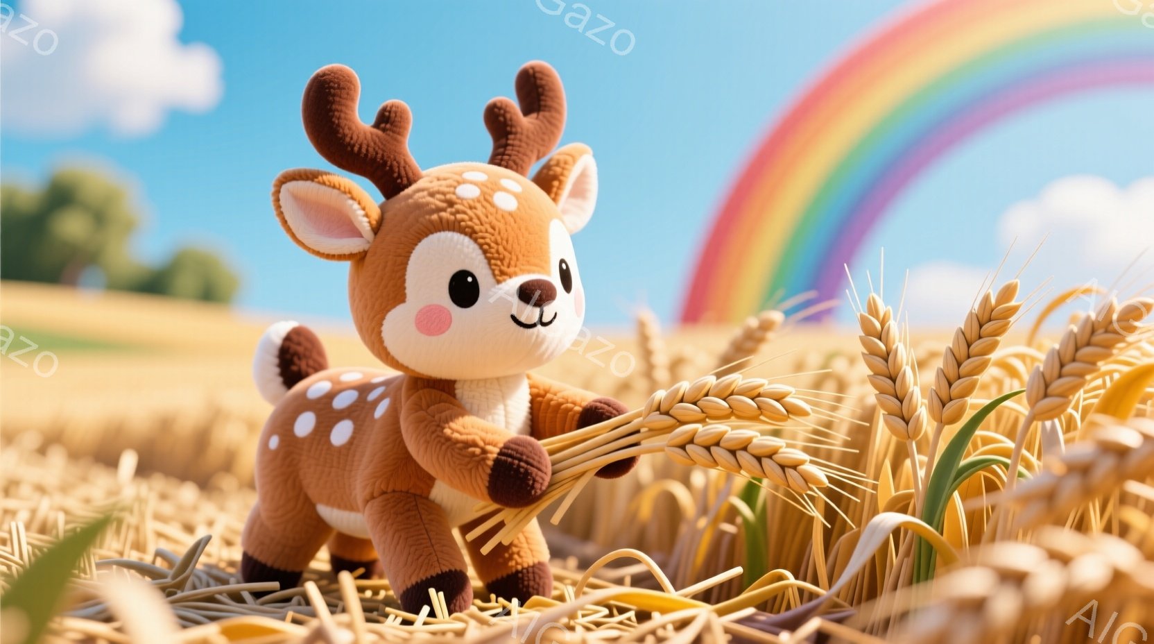 ふわふわの茶色のシカのぬいぐるみが、黄金色の麦畑の中で正面を見据えています。シカは白い斑点模様があり、短い角と愛らしい表情をしています。背景には、虹と緑豊かな木々が見え、晴れた日の穏やかで牧歌的な雰囲気を醸し出しています。