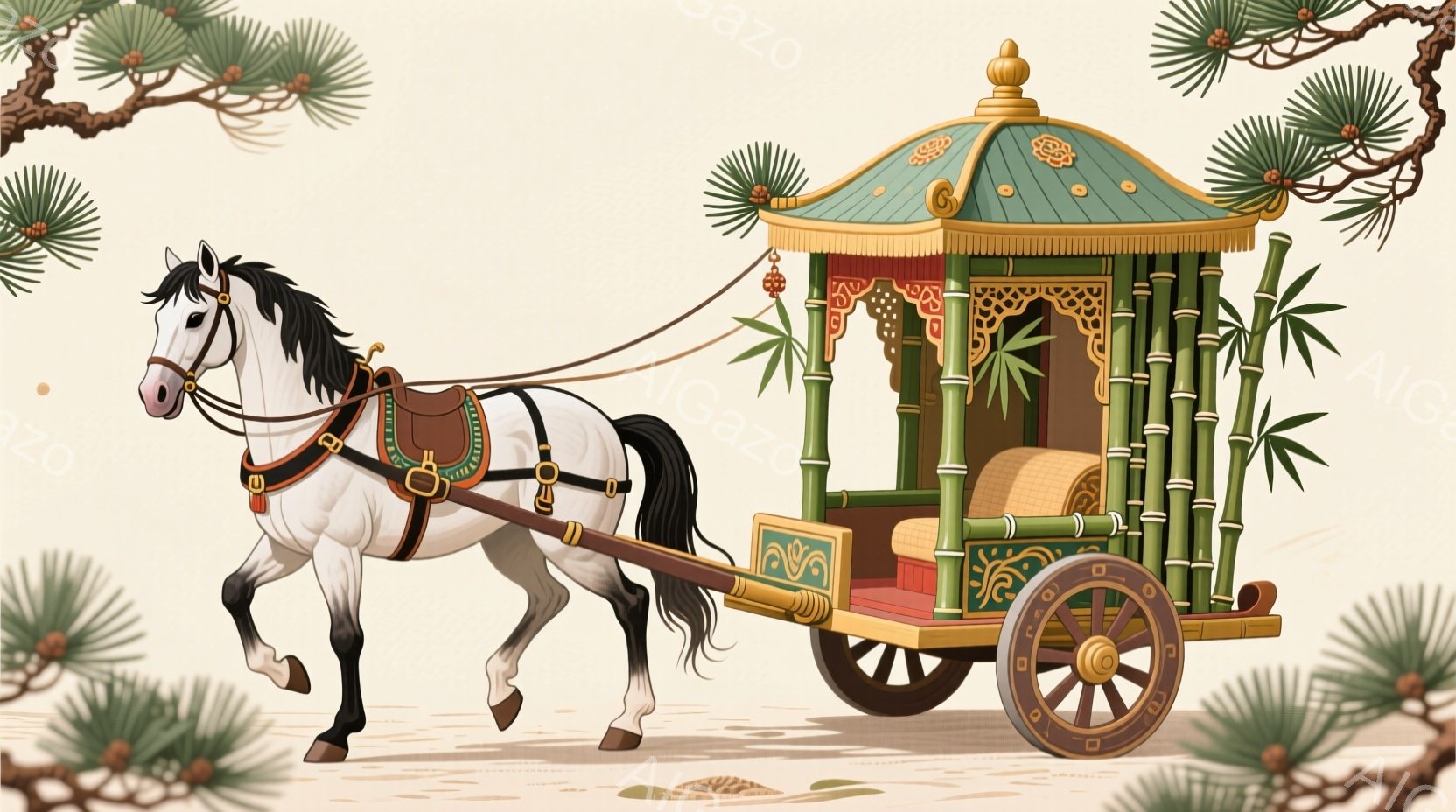 白い馬が装飾された馬車を引いている様子が描かれています。馬車は緑と赤を基調とした豪華なデザインで、窓にはカーテンが飾られています。背景には砂地と緑の草が生い茂り、遠くには木々が見え、晴れた日の穏やかな雰囲気を醸し出しています。