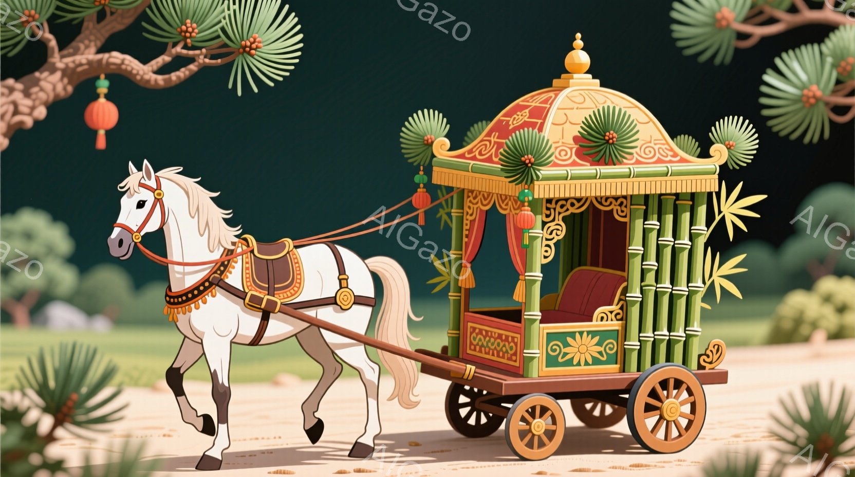白い馬が華やかなパラン車を牽いて草原を駆けている。パラン車は赤、金、緑などの鮮やかな色彩で装飾され、豪華な雰囲気を醸し出している。背景には緑豊かな木々と青空が広がり、穏やかで平和な情景が描かれている。