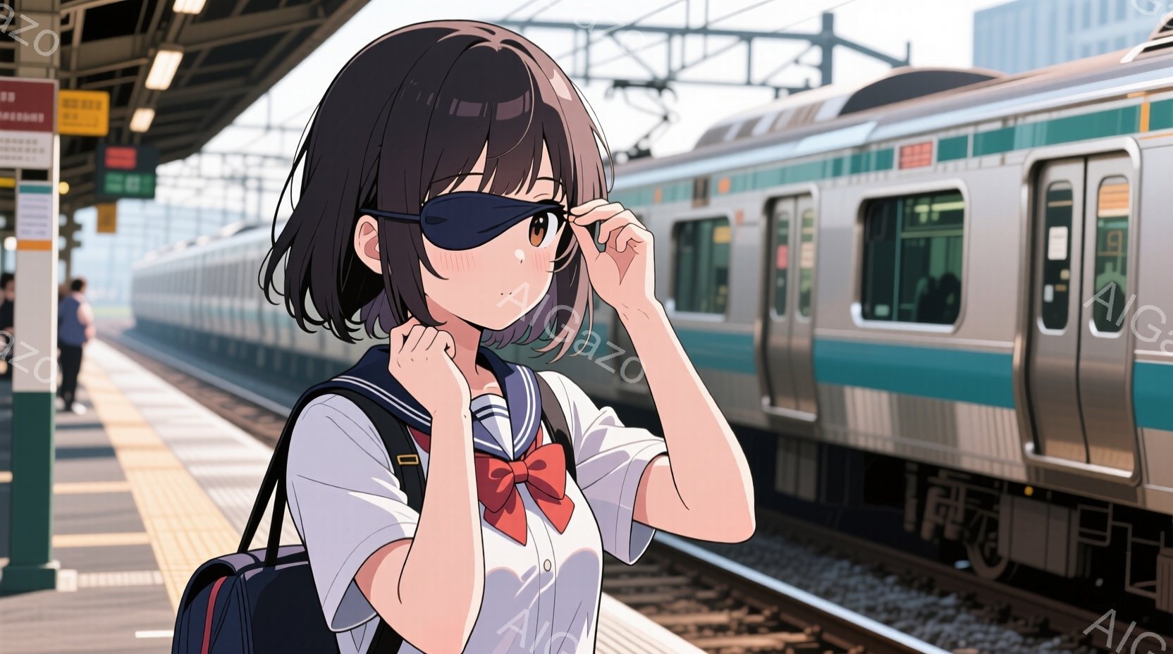 制服を着た若い女性が描かれており、短い茶色の髪は肩のあたりでカットされ、前髪が少し目にかかっています。彼女は両手で目を覆っており、少し恥ずかしそうな表情をしています。背景には、電車が停車している駅のプラットフォームがあり、他の人々もぼんやりと見えます。