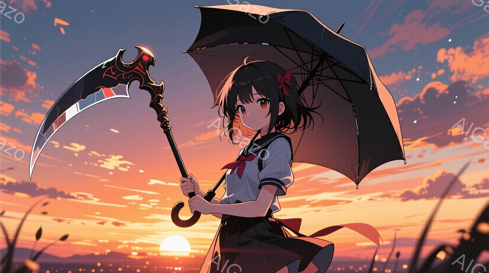 夕焼けを背景に、セーラー服を着た少女が鎌のような武器を持っています。彼女は黒髪で、髪飾りをつけており、少し微笑んでいるような表情をしています。背景には夕焼け空と、遠くに見える街並み、そして草原の草が描かれており、幻想的で少し不気味な雰囲気を醸し出しています。