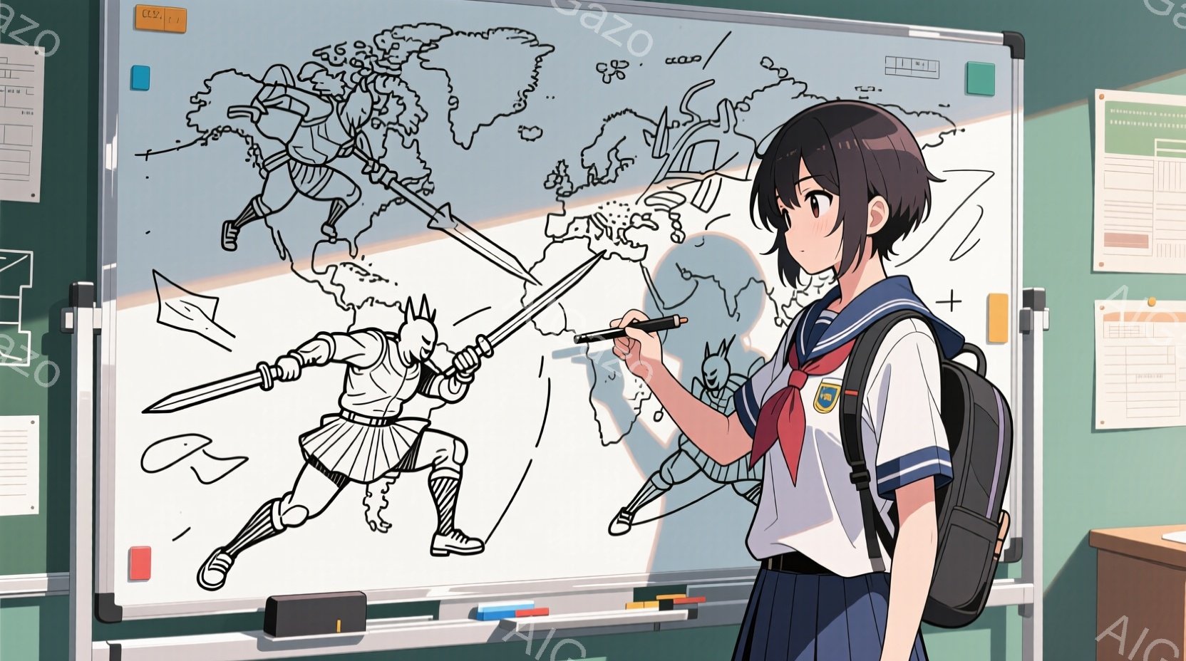 茶髪のショートヘアの女子学生が、世界地図が描かれた黒板の前でペンを持っている。彼女は制服を着ており、肩にリュックサックを背負い、南米大陸を指し示している。教室の背景には、棚やポスターがあり、全体的に学習に集中している、あるいは地理の授業風景を想起させる雰囲気がある。