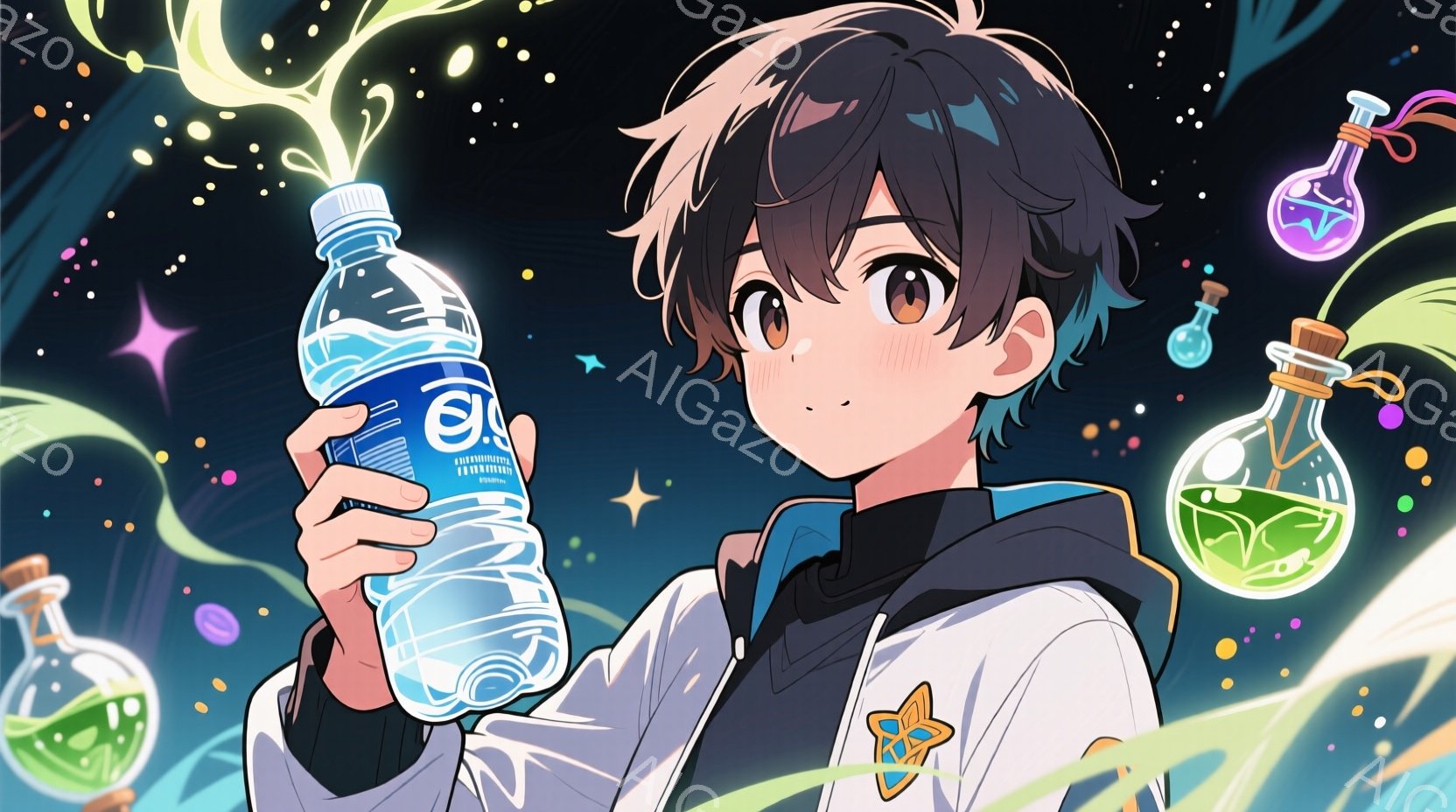 少年は、白いフード付きのセーターの下に青と白のジャケットを着て、少し微笑んでいます。彼は右手に透明な水のボトルを持っており、そこから青い光の粒子が舞い上がっています。背景には、紫色の液体が入ったガラス瓶がいくつか浮かんでおり、キラキラと光る粒子が散りばめられており、ファンタジーのような神秘的な雰囲気を作り出しています。