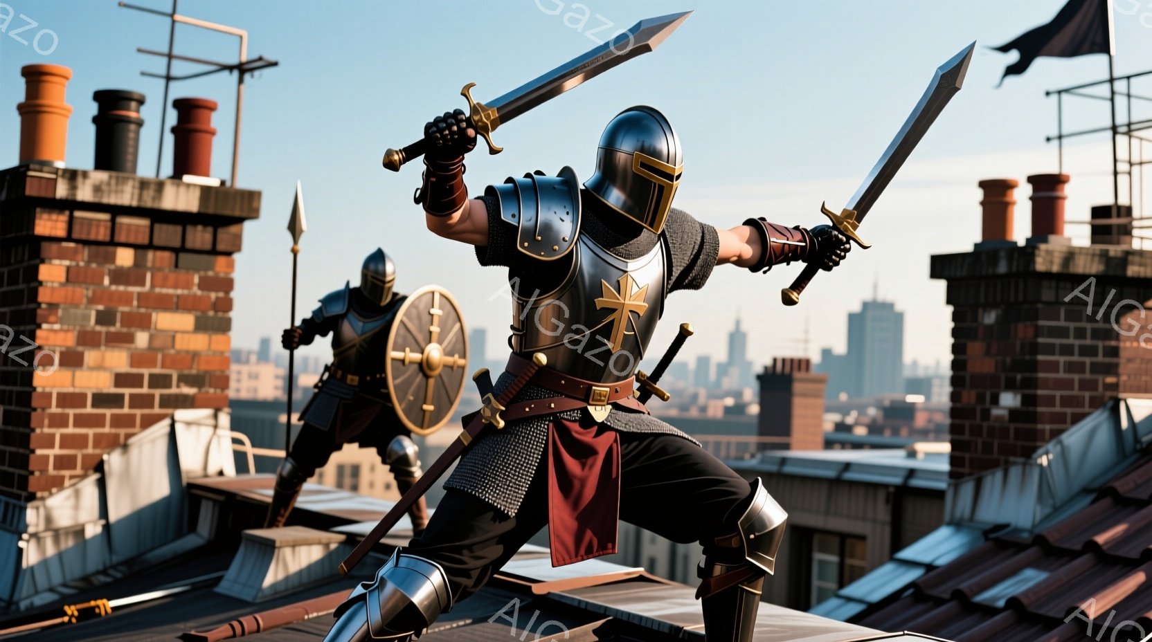 中世の騎士が、近代的な都市の屋上に立っている。彼は全身を鎧で覆い、左手に盾、右手に剣を持ち、警戒したような姿勢で周囲を見渡している。背景には高層ビル群や煙突が並び、晴天の下、中世と現代が混在する奇妙な光景を作り出している。