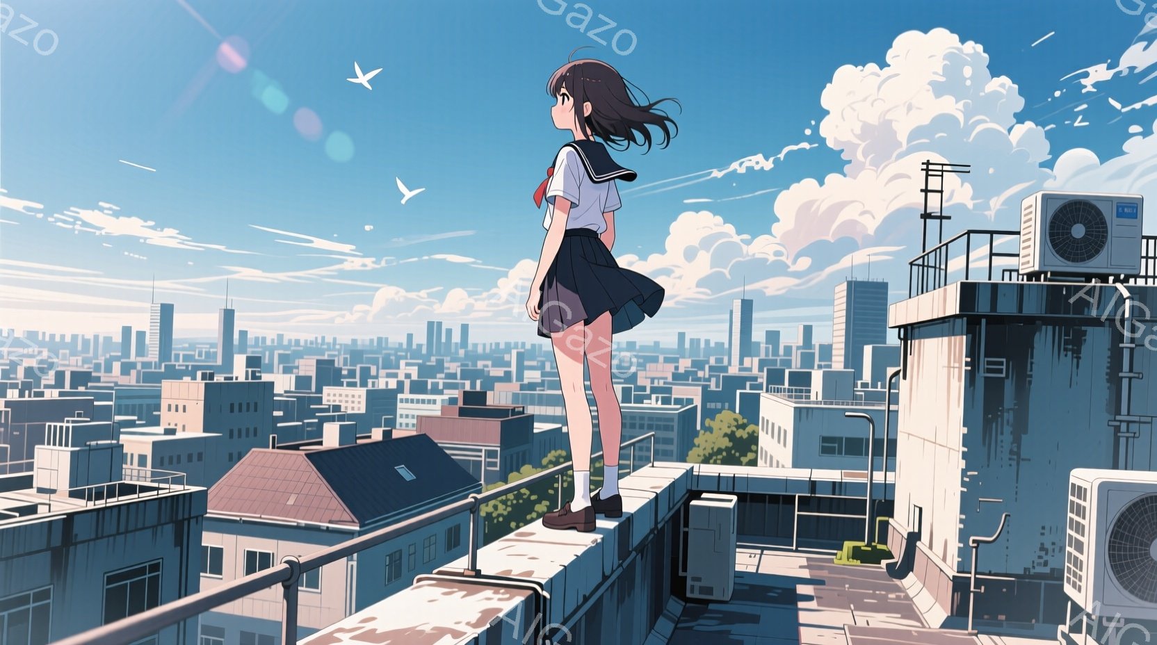 制服を着た少女が屋根の上に立っている様子が描かれています。彼女は黒髪で、風になびく長い髪を持ち、背中を向けて遠くを見つめています。背景には、密集した都市の建物と、広大な白い雲が広がる青空が広がっており、爽やかで少し物憂げな雰囲気を醸し出しています。