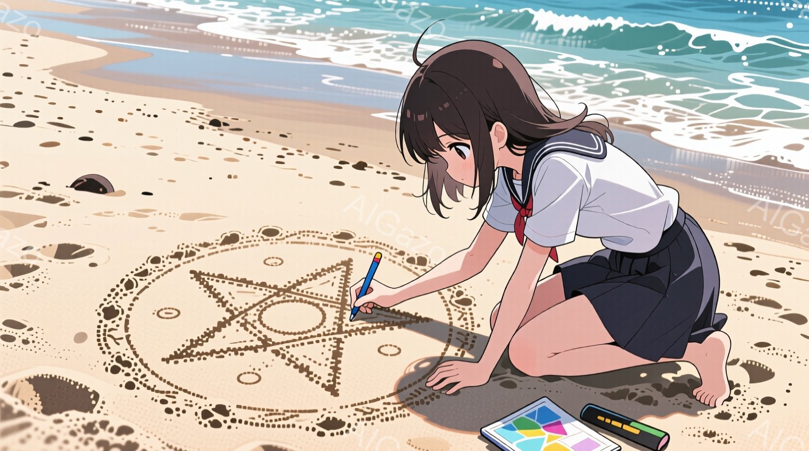 金色の髪の少女が砂浜に魔法陣を描いている。白いタンクトップと黒いショートパンツを着用し、膝をついて砂にペンで円や記号を描き加えている。背景には青い海と白い波が広がり、晴天で穏やかな雰囲気である。