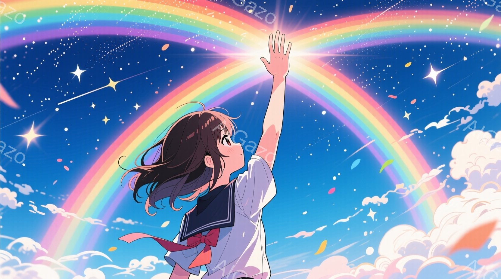 この無料AI生成画像「短い黒髪の少女が、白いセーラー服を着て、右手を空に向かって伸ばしています。背景には鮮やかな虹がかかり、オレンジや黄色の花びらが舞い散る、晴れた空と白い雲が広がっています。全体的に、希望に満ちた、明るく優しい雰囲気が漂っています。」は、2025年10月23日に作成されました。 サイズは 1664×928px の高解像度で、商用利用も可能なフリー素材として提供しています。