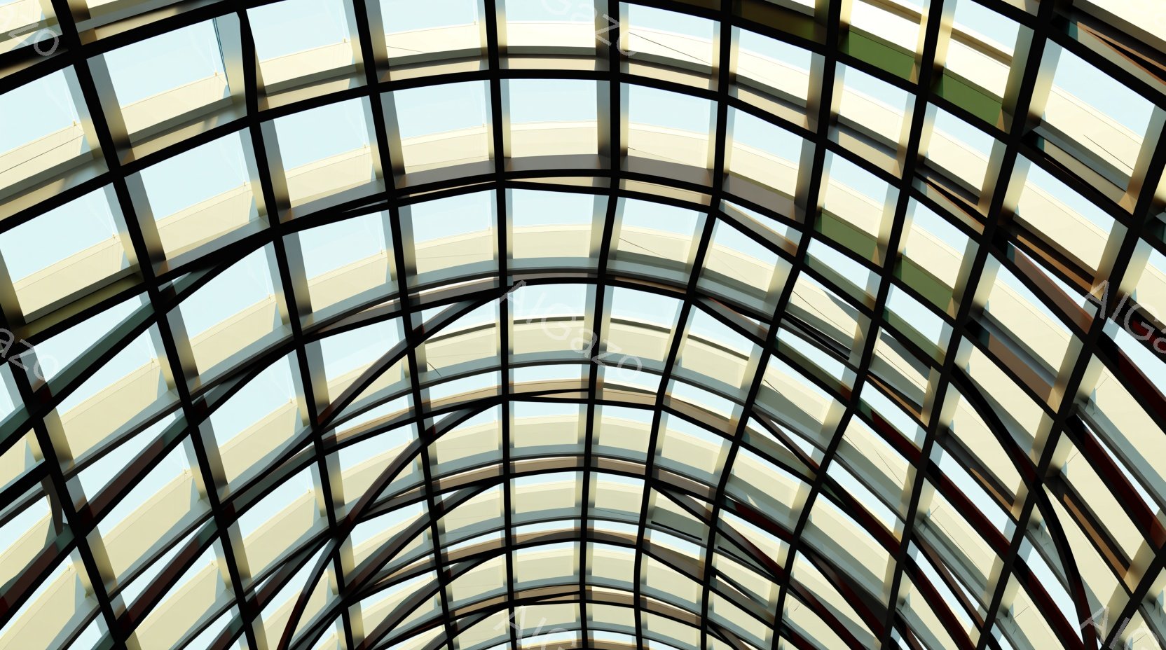 高い天井を持つ建築物の内部を捉えており、幾何学的なデザインの窓が規則的に並んでいるのが特徴です。窓は青い空と雲を映し出し、明るく開放的な空間を作り出しています。構造材は明るい色をしており、全体的に現代的で洗練された雰囲気を醸し出しています。