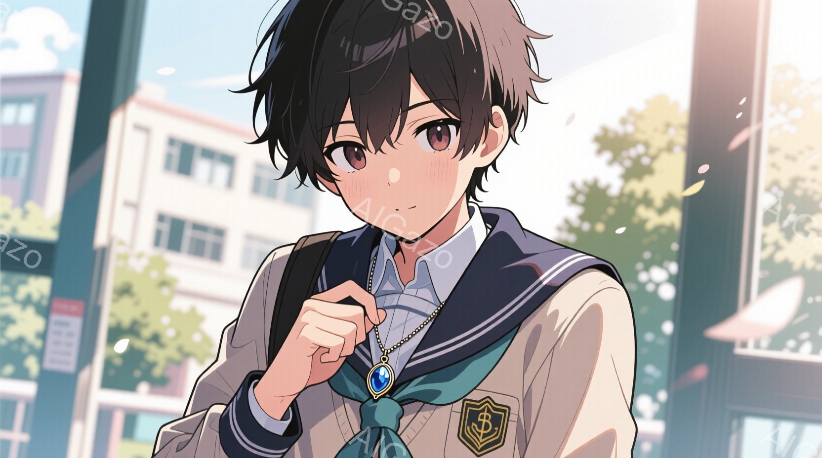 紺色の髪で、少し頬を赤らめた若い男性が描かれています。彼は白いシャツに紺色のブレザー、ネクタイ、そして肩にかかるバッグを身に着けており、首には青い宝石のようなペンダントが光っています。背景には教室らしき場所が見え、窓から差し込む光が暖かく、少年が少し恥ずかしがっているような、優しい雰囲気が漂っています。
