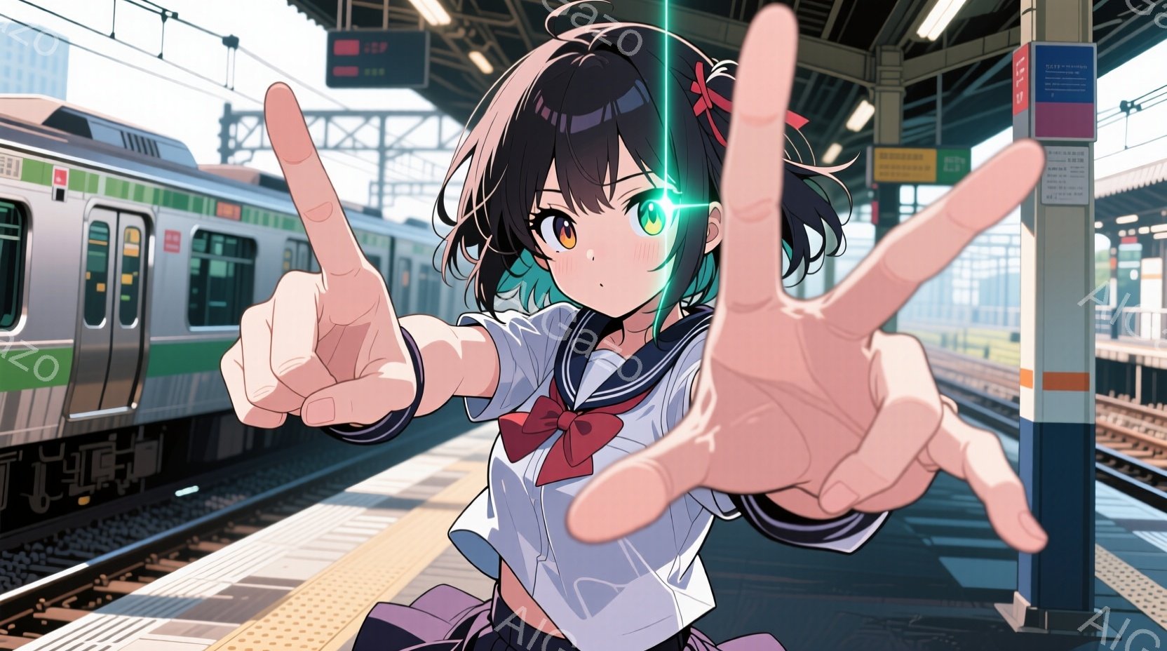 黒髪と水色のグラデーションヘアの少女が、鉄道の駅のプラットフォームで右手を指し示しています。彼女は白いブラウスにネクタイとセーラー服、スカートを着用しており、活気に満ちた表情で何かを強調しています。背景には、列車、プラットフォームの標識、そしてややぼやけた駅構内が広がっており、晴れた日の駅の賑やかな雰囲気が感じられます。