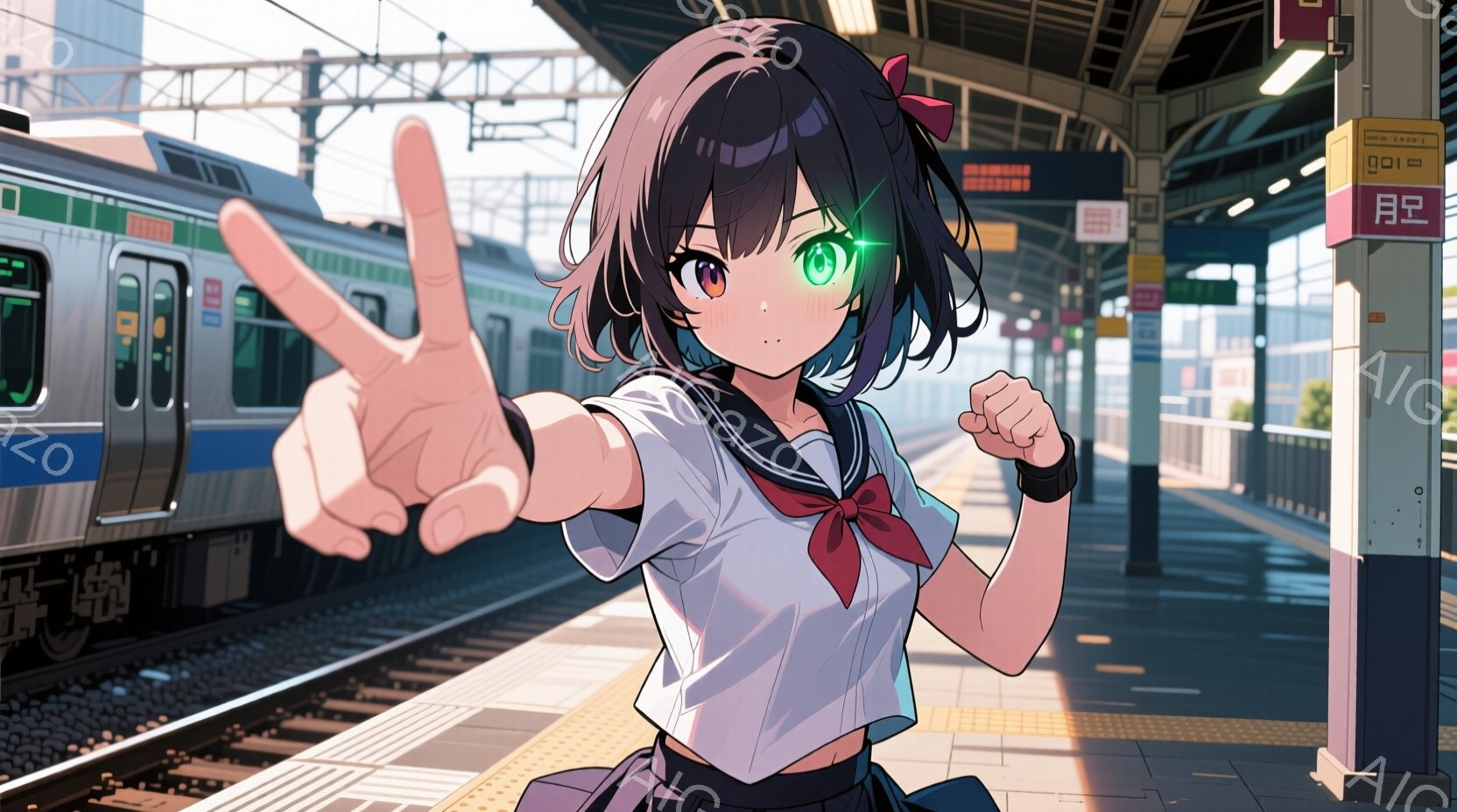 茶髪とターコイズブルーのグラデーションヘアの少女が、鉄道の駅のプラットフォームで、片手を前に突き出し、指を指している。彼女は白いブラウスにネイビーのスカート、赤色のリボンタイという制服を着ており、活気に満ちた表情で、まるで視聴者に何かを訴えかけているようだ。背景には、鉄道の線路と電車、そして日差しが差し込む青空が見え、躍動感のある、明るい雰囲気を醸し出している。