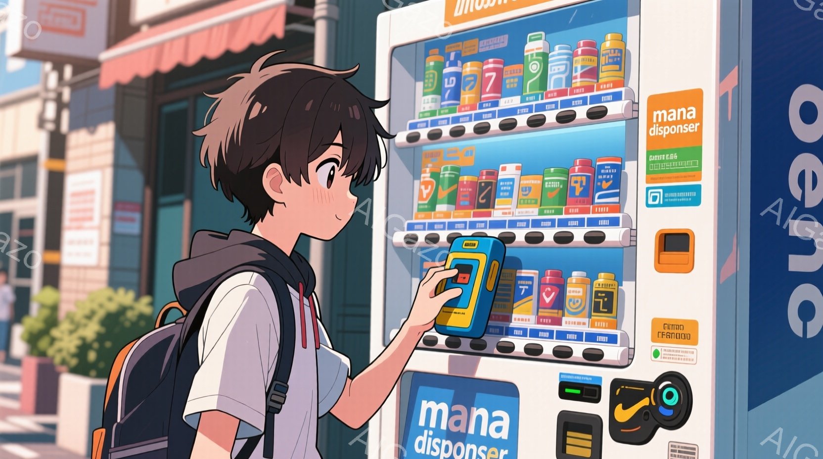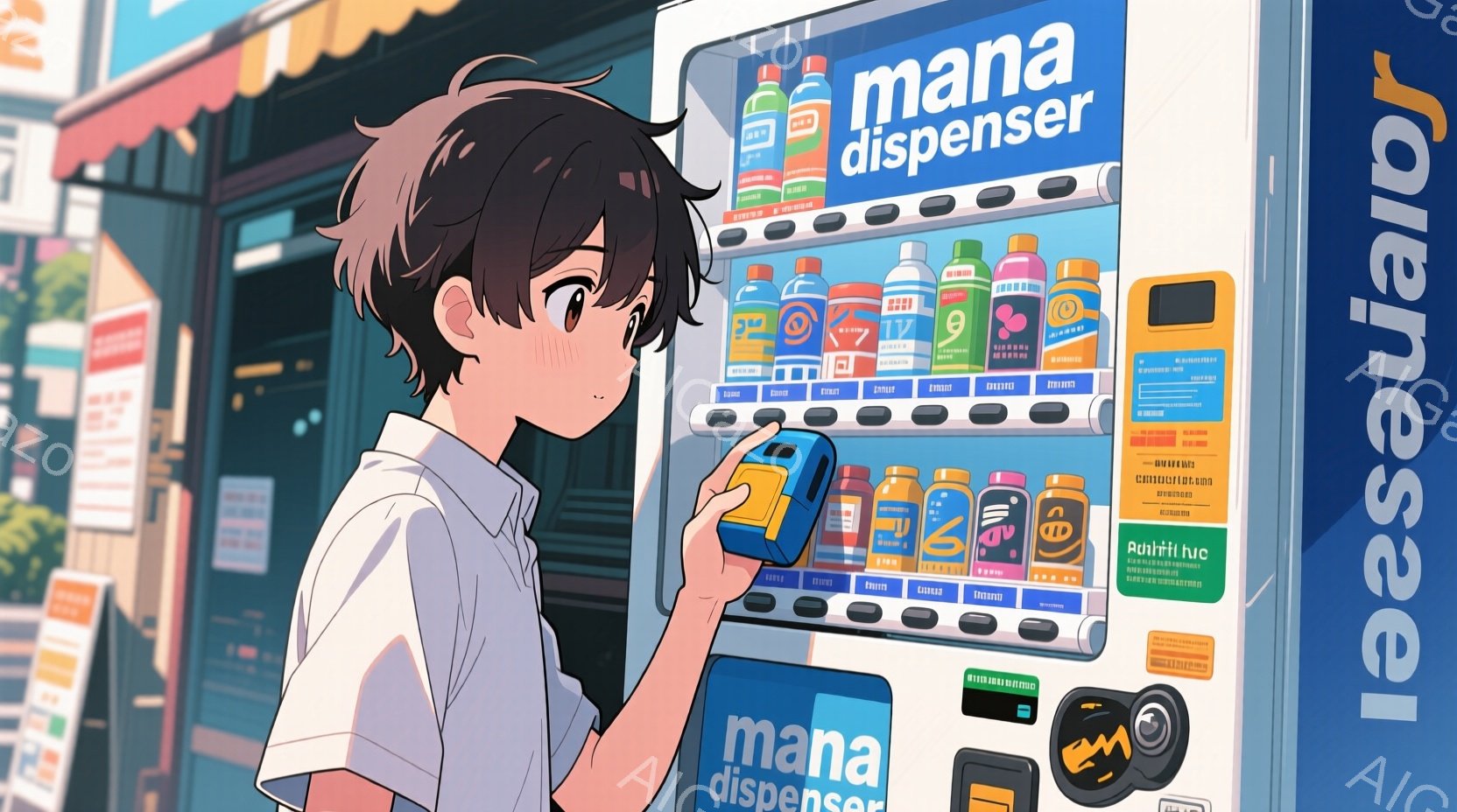 若い男性が自動販売機に向かって何かをスキャンしている様子が描かれています。彼は黒髪で、白いシャツに濃い色のベストとリュックサックを背負っており、やや前かがみの姿勢で携帯電話のようなデバイスを自動販売機にかざしています。背景にはカラフルな建物と緑の木々が見え、晴れた日の穏やかな雰囲気が漂っています。