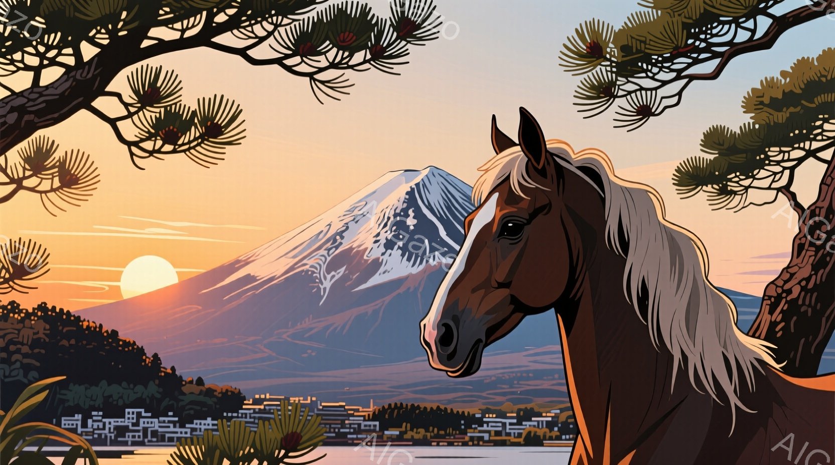 この無料AI生成画像「夕焼け空を背景に、茶色の馬が右側に大きく描かれている。遠景には富士山と、湖畔に並ぶ家々が見え、穏やかで静謐な雰囲気を醸し出している。馬は落ち着いた表情で、見る方向にはっきりとした視線が向けられている。」は、2025年10月22日に作成されました。 サイズは 1664×928px の高解像度で、商用利用も可能なフリー素材として提供しています。