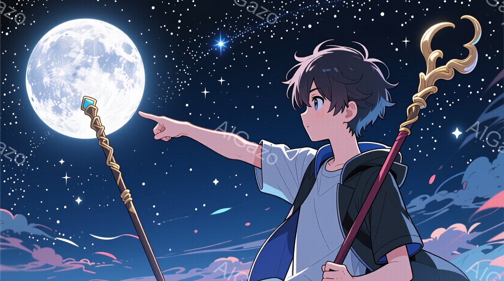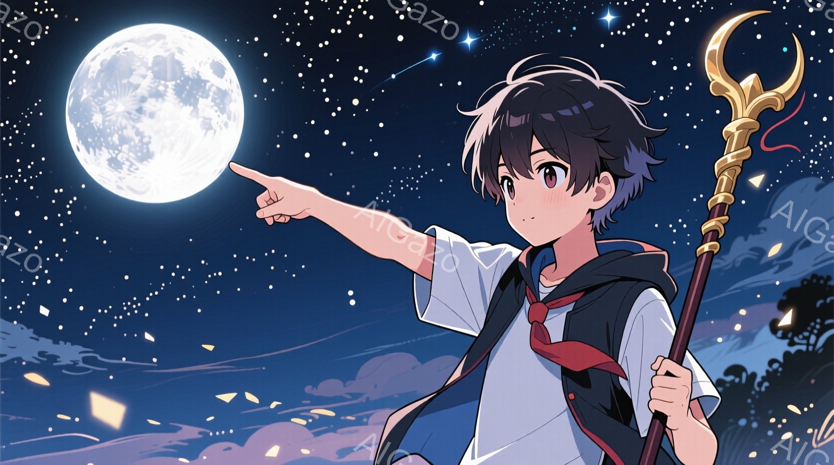 少年は紺色のセーラー服を着ており、右手を伸ばして何かを指し示しています。彼の髪は黒く、少しカールしており、表情はどこか決意に満ちています。背景には満月と星空が広がり、夜空を照らす光が幻想的な雰囲気を醸し出しています。