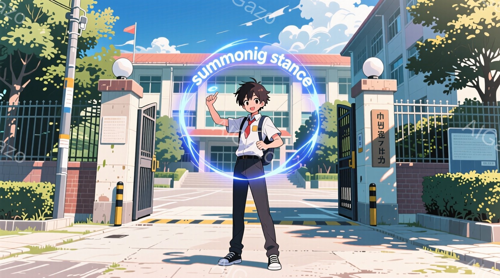 短い黒髪の少年が制服を着て、門の前に立っている。彼は右手を上げて、青いエネルギーのようなものを発しているように見える。背景には、白い建物と緑豊かな木々があり、晴れた空が広がっている。