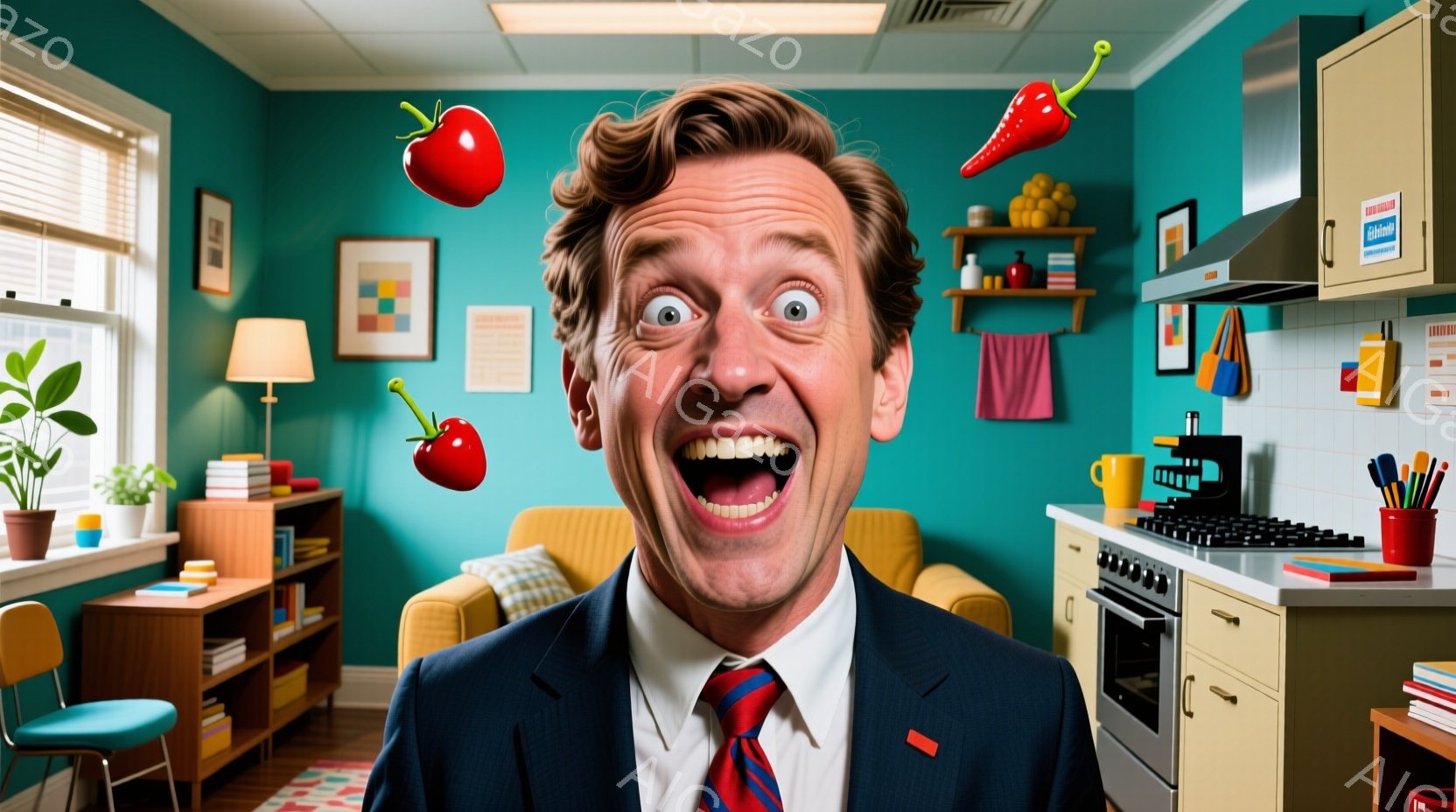 驚いた表情をした男性が、黒いスーツに赤いネクタイ姿で正面を向いています。彼の髪はふわふわとカールしており、目は大きく開いて口も大きく開いています。背景は教室で、緑色の壁、木製の机と椅子、そして壁に掛けられた絵画や植物が見えます。