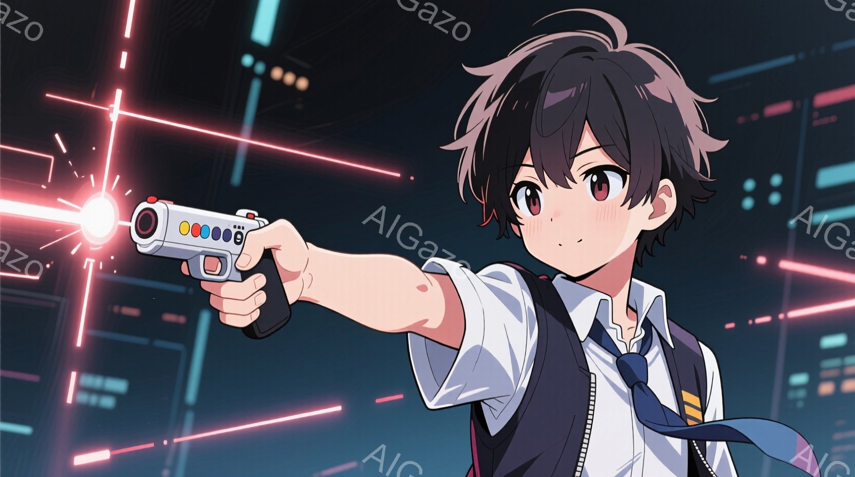 人物は右手を持って、レイザー状の光を放つ空気を切り裂くようなポーズをとる青年のアニメキャラクターです。彼は短髪で、鋭い目線が特徴的な表情をしています。彼は学生風の制服に身を包み、自信ある態度を示すように左腕を自信を持って前に突き出させています。