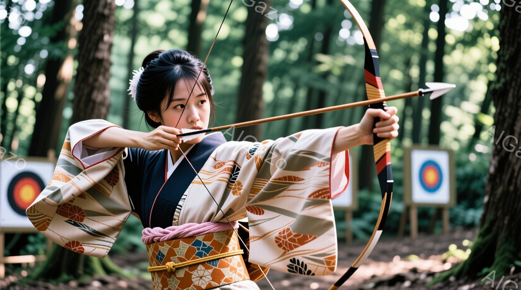 若い女性が弓を持ち、矢を引いている姿が写っている。彼女は白いTシャツと紺色のベストを着ており、短く切り揃えられた黒髪が特徴的だ。背景にはターゲットと緑豊かな自然が広がり、集中した表情で競技に臨んでいる様子が伝わる。