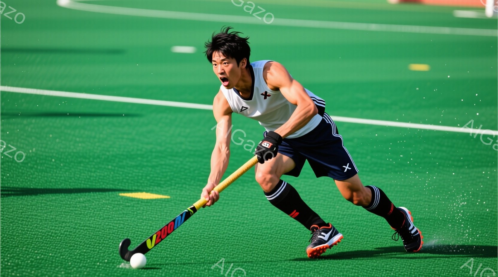 緑色の芝生の上でホッケー選手がプレーしている様子が写っている。白地に青のラインが入ったユニフォームとソックスを着用し、黒髪を短くまとめている。選手はホッケーのボールを打とうとする姿勢で、集中した表情をしている。