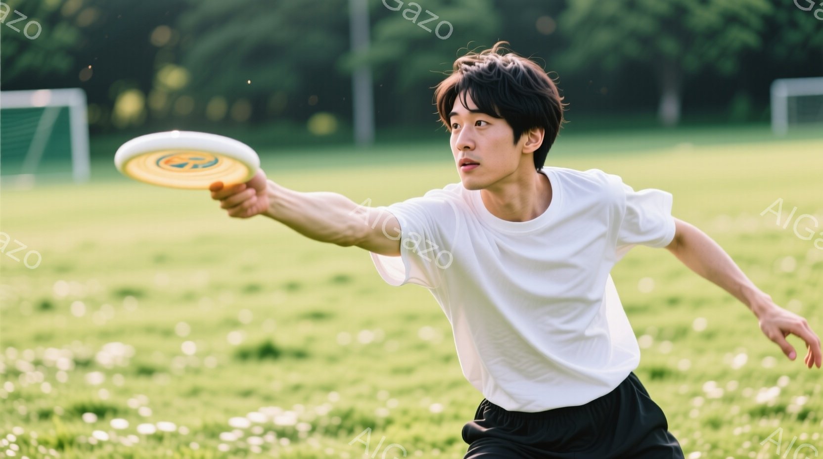 若い男性が緑の芝生の上でフリスビーを投げているところを捉えた写真です。白いTシャツと黒いショーツを着用し、少し長めの黒髪が特徴的です。背景には緑豊かな木々が見え、晴天の下でアクティブな一日を楽しんでいる様子が伝わってきます。