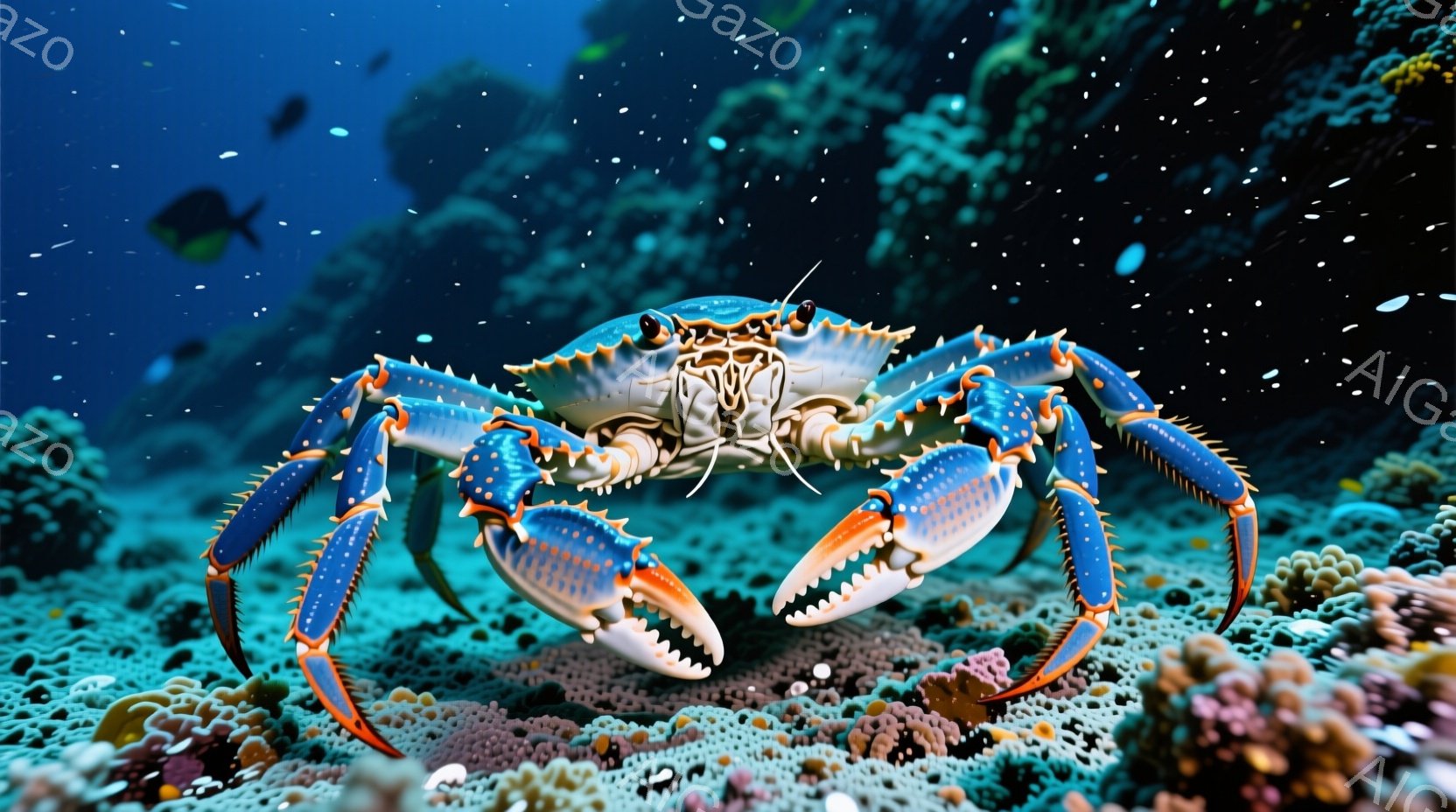 鮮やかな青色のカニが、砂と貝殻が散らばる海底に力強く立っている。鋭い爪と黒い目が印象的で、まるでこちらを見つめているかのような視線を感じさせる。背景には暗い海が広がり、水中に漂う小さな光点が幻想的な雰囲気を醸し出している。
