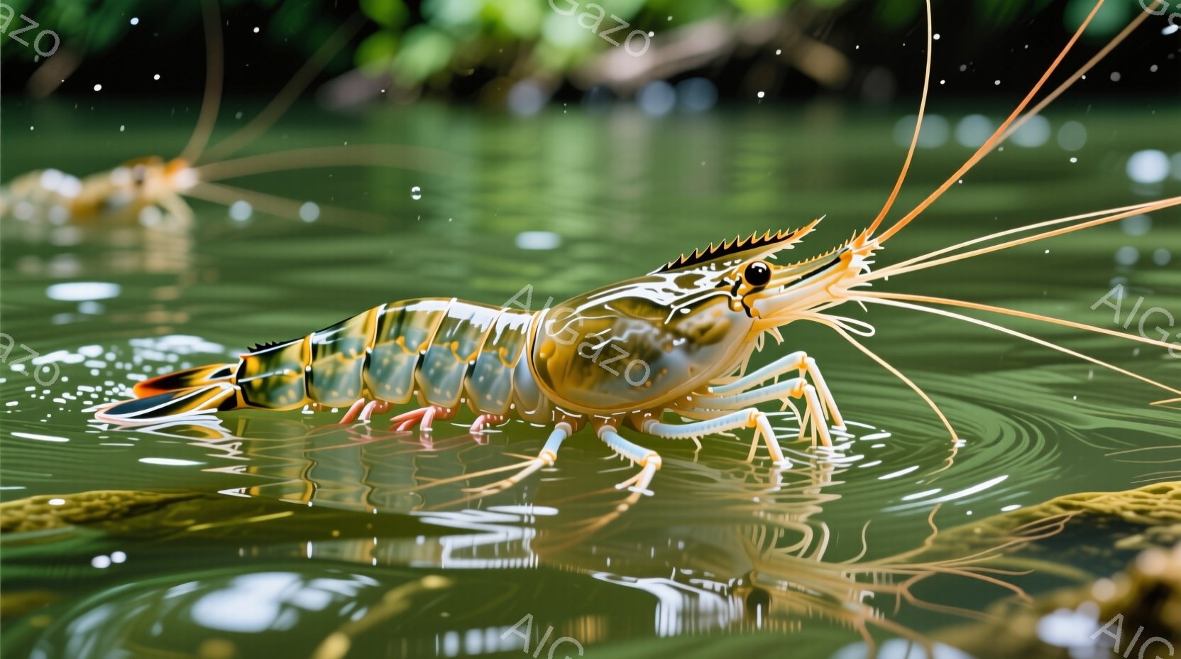 大きなエビが水面を歩いているように見える鮮明な写真です。エビの体は白と茶色の縞模様で覆われ、長い触覚と脚が水面に反射してキラキラと輝いています。背景は緑豊かな水生植物で覆われており、穏やかで自然な雰囲気を醸し出しています。
