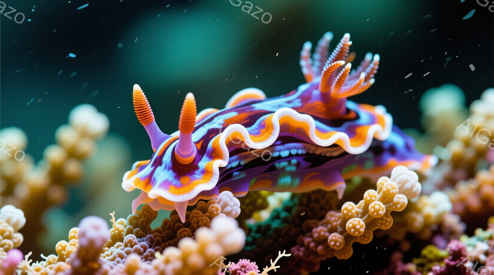 この無料AI生成画像「深い紫色とオレンジ色の縞模様を持つウミウシが、ピンク色の珊瑚礁の中にいます。ウミウシは触角のような突起を頭上に持ち、珊瑚の間に体を滑らせているかのようなポーズをとっています。背景はぼやけており、鮮やかな珊瑚礁が密集している様子がわかります。」は、2025年10月23日に作成されました。 サイズは 1664×928px の高解像度で、商用利用も可能なフリー素材として提供しています。