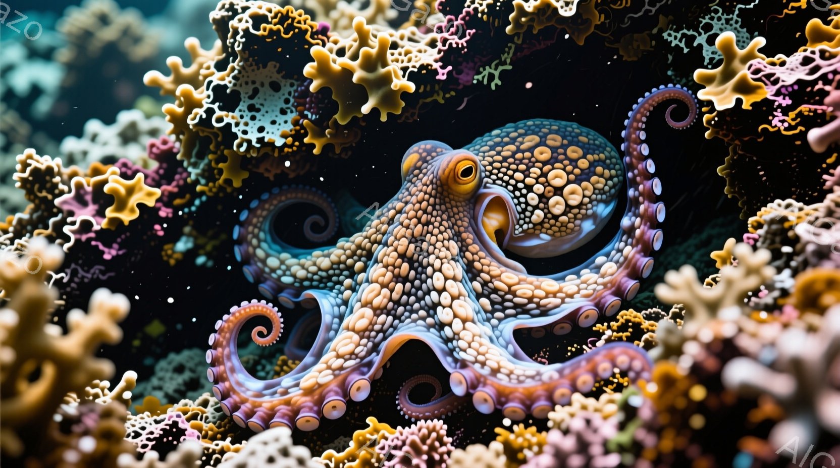 鮮やかな色彩のタコが、暗い背景に浮かび上がっています。その体は、白、紫、オレンジ色の小さな斑点模様で覆われ、触腕は優雅に曲線を描き、まるで芸術作品のようです。背景には、様々な色合いの珊瑚礁が密集し、神秘的で幻想的な深海の世界を表現しています。