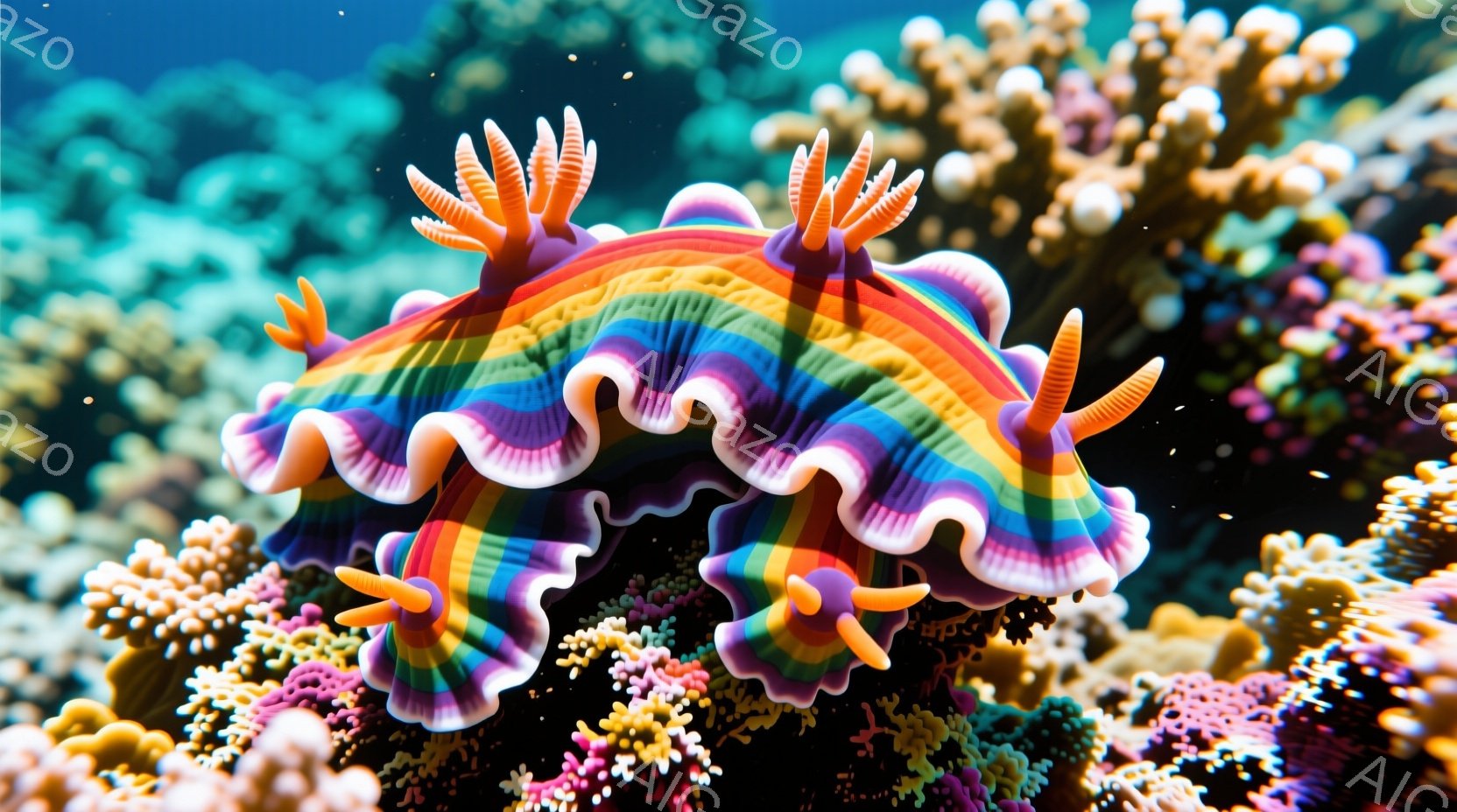 美しい色彩豊かなスベカタツオが、鮮やかな珊瑚礁の中に浮かんでいる。その身体は、オレンジ、紫、ピンク、黄色といった虹色の帯で覆われ、繊細な触手が優雅に広がっている。背景は様々な色の珊瑚で埋め尽くされ、まるで夢の中のような幻想的な雰囲気を醸し出している。