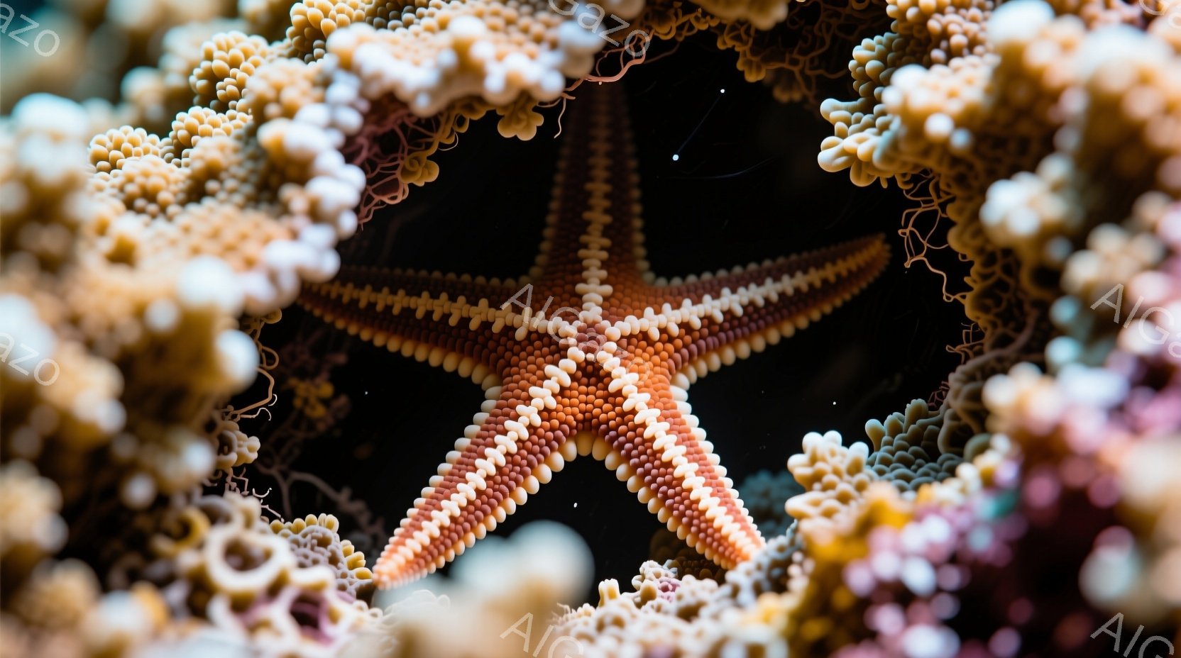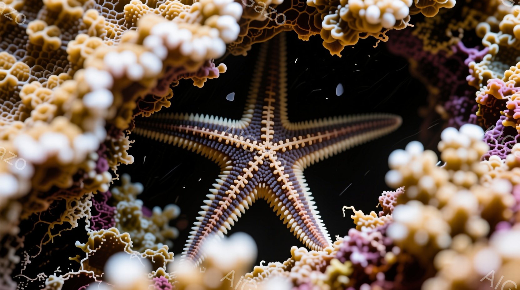 黒い背景に、複雑な模様を持つ星形のヒトデが中央に配置されている。ヒトデの周囲には、さまざまな色合いのサンゴが密集しており、まるでフレームのようにヒトデを囲んでいる。深海を思わせる暗く神秘的な雰囲気が漂い、サンゴのテクスチャとヒトデの繊細な模様が美しいコントラストを生み出している。