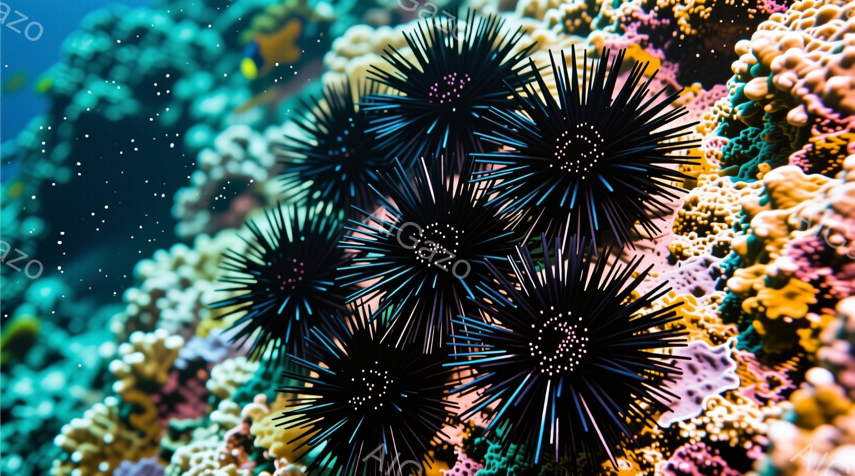 鮮やかな珊瑚礁の中に、黒くて棘のあるウニが複数密集して写っている。珊瑚はピンク、オレンジ、白など様々な色で彩られ、ウニとのコントラストが印象的だ。全体的に色彩豊かで、海中の生命の活気に満ちた様子が伝わってくる。
