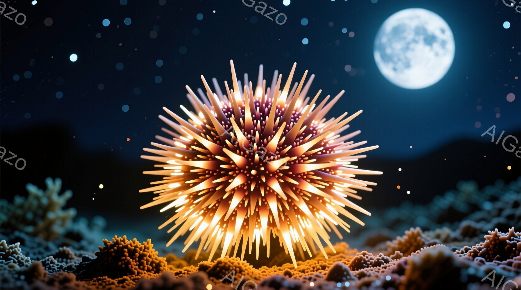 深い青色の背景に、輝くオレンジ色のウニが描かれています。ウニは鮮やかな光を放ち、周囲の茶色の珊瑚礁の上に位置しています。背景にはぼやけた山々と、小さな光の粒子が散りばめられた夜空が広がっており、神秘的で幻想的な雰囲気を醸し出しています。