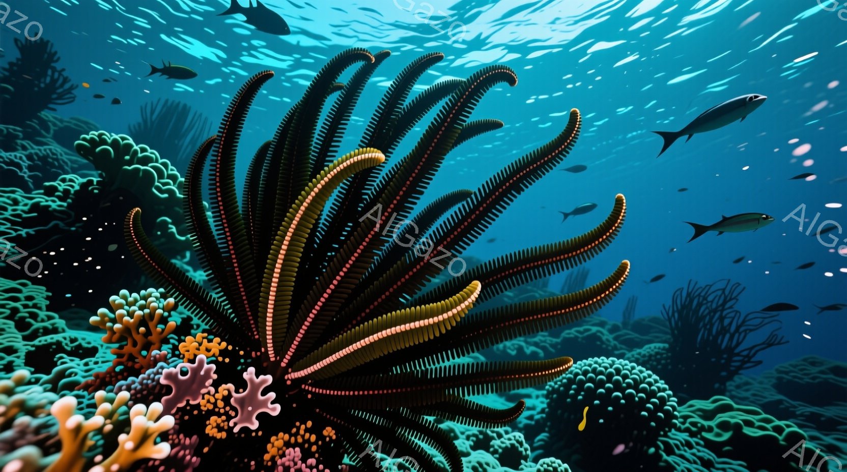 深い青色の海中に、茶色と黒色の巨大なウミユリが咲き誇っている。鮮やかなピンクや白のサンゴ礁がウミユリの周りを彩り、背景には小さな魚の群れが漂っている。全体的に静かで神秘的な、深海の雰囲気が漂う。