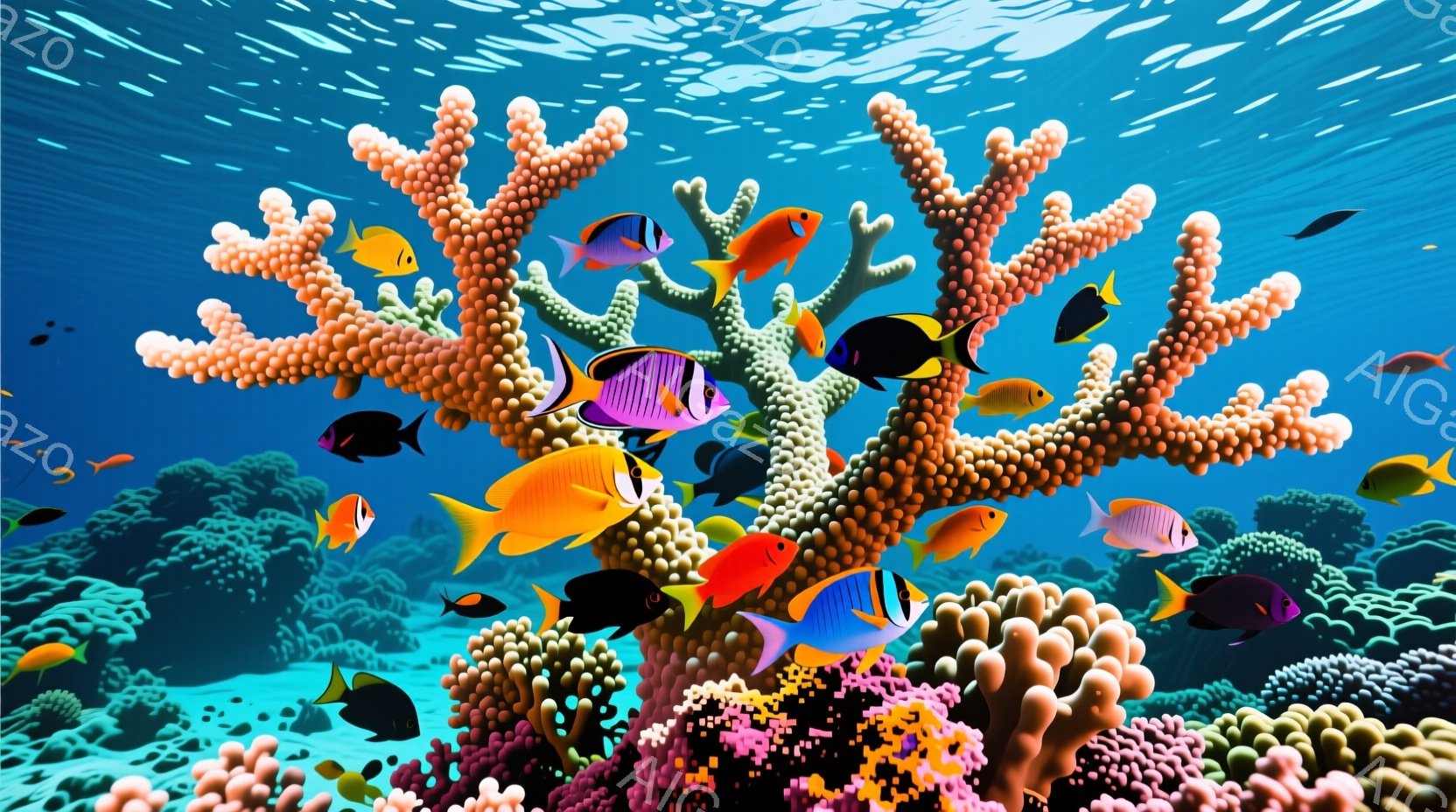 色とりどりの熱帯魚が、サンゴ礁の周りを活発に泳いでいる様子が描かれています。背景は青い海で、太陽光が差し込み、水面がきらめいています。サンゴ礁は様々な形と色をしており、海底に豊かな生態系が存在することを示唆しています。